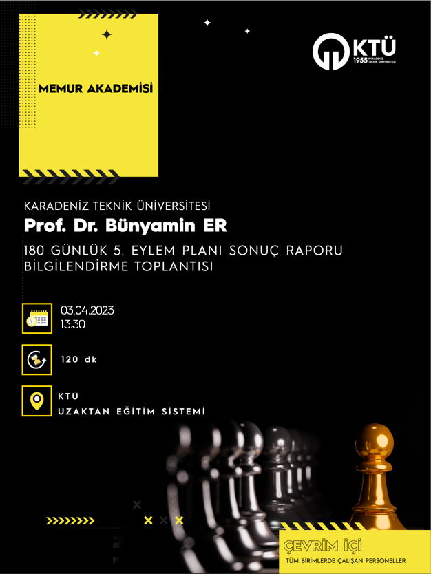 Üniversitemiz Genel Sekreterliği tarafından yürütülen eylem planlarının 5. dönem sonuç raporu hakkında bilgilendirme toplantısı Genel Sekreter V. Prof. Dr. Bünyamin ER tarafından KTÜ Uzaktan Eğitim Sistemi aracılığıyla çevrim içi olarak 03.04.2023 tarihinde saat 13.30'da gerçekleştirilecektir.