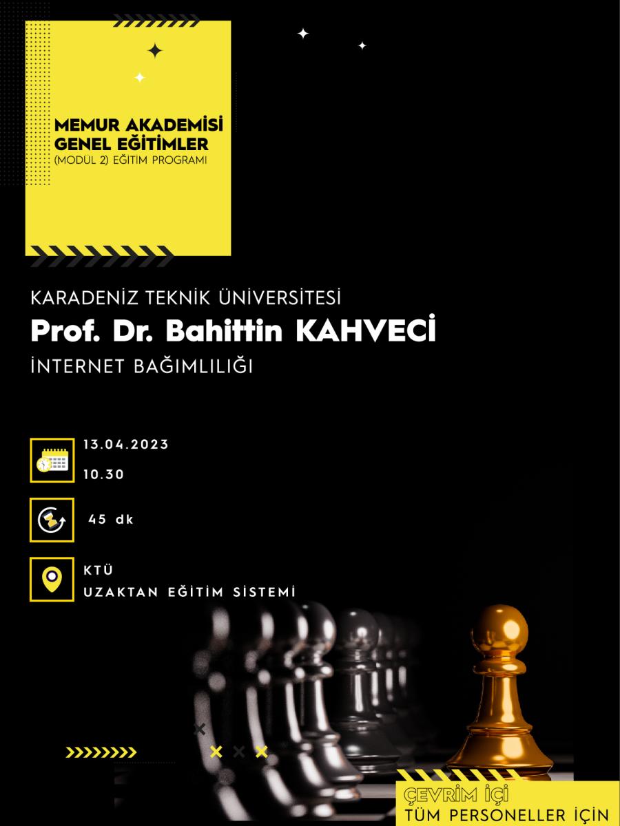 Üniversitemiz Sağlık Bilimleri Fakültesi öğretim üyesi Prof. Dr. Bahittin KAHVECİ tarafından tüm personellerimize yönelik "İnternet Bağımlılığı" eğitimi çevrim içi olarak KTÜ Uzaktan Eğitim Sistemi aracılığıyla 13.04.2023 tarihinde saat 10.30'da gerçekleştirilecektir.