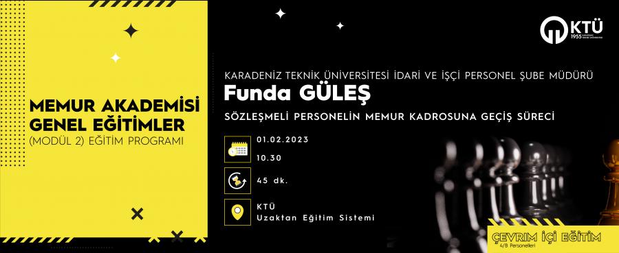 Ünivesitemiz Personel Daire Başkanlığı İdari ve İşçi Personel Şube Müdürü Funda GÜLEŞ tarafından 4/B'li sözleşmeli personellerimize özel memur kadrosuna geçiş süreci konulu eğitim çevrim içi olarak gerçekleştirilecektir.