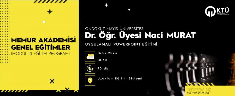 Uygulamalı PowerPoint Eğitimi OnDokuz Mayıs Üniversitesi Doktor Öğretim Üyesi Naci MURAT tarafından tüm personellerimize özel "Uygulamalı Powerpoint Eğitimi" çevrim içi olarak gerçekleştirilecektir.