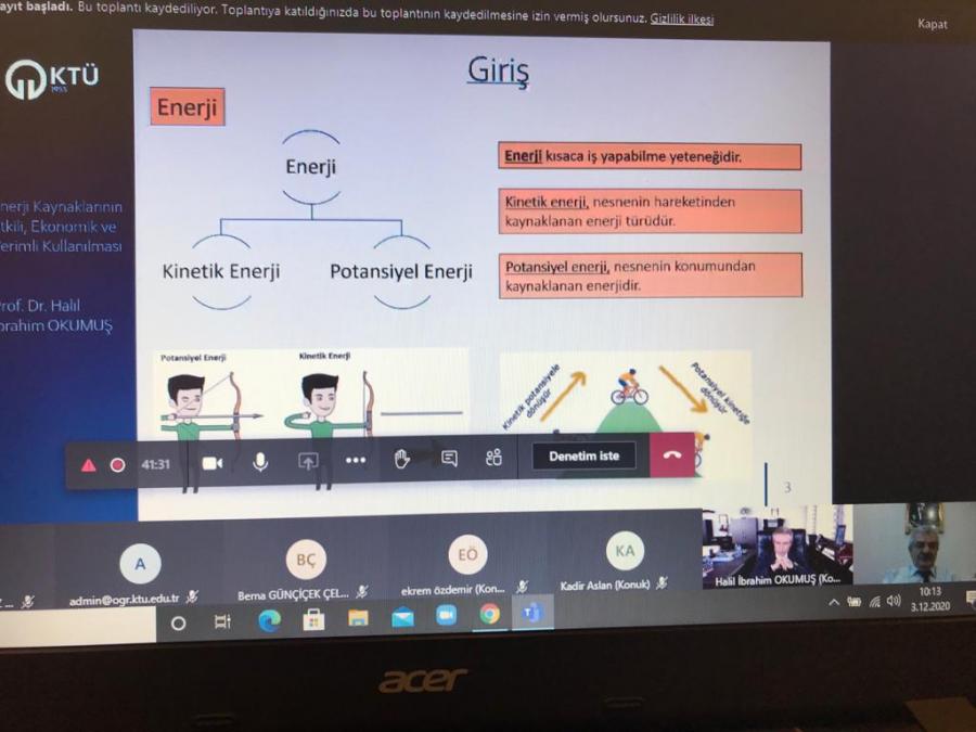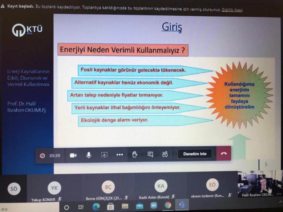 03.12.2020 Perşembe günü 10.00 -12.00 saatleri arasında gerçekleştirilen eğitimde, "Enerji nedir? Enerji Verimliliği, Enerji Tasarrufu Enerjiyi Yönetmek, Enerji Sisteminde Elektrikli Ev Aletleri, Aydınlatma, Yalıtım, İklimlendirme" konularında tasarruf tedbirleri, sanayide enerji verimliliği, ülkemizde enerji üretimi ve kullanımı, enerji tasarrufu için basit çözümler konularını anlatıldı. Kullanıcıların tekrar izleyebilmesi için eğitim kayıt altına alındı. Verilen eğitimin son bölümünde Prof. Dr. Halil İbrahim OKUMUŞ katılanların soruları cevaplandırıldı.