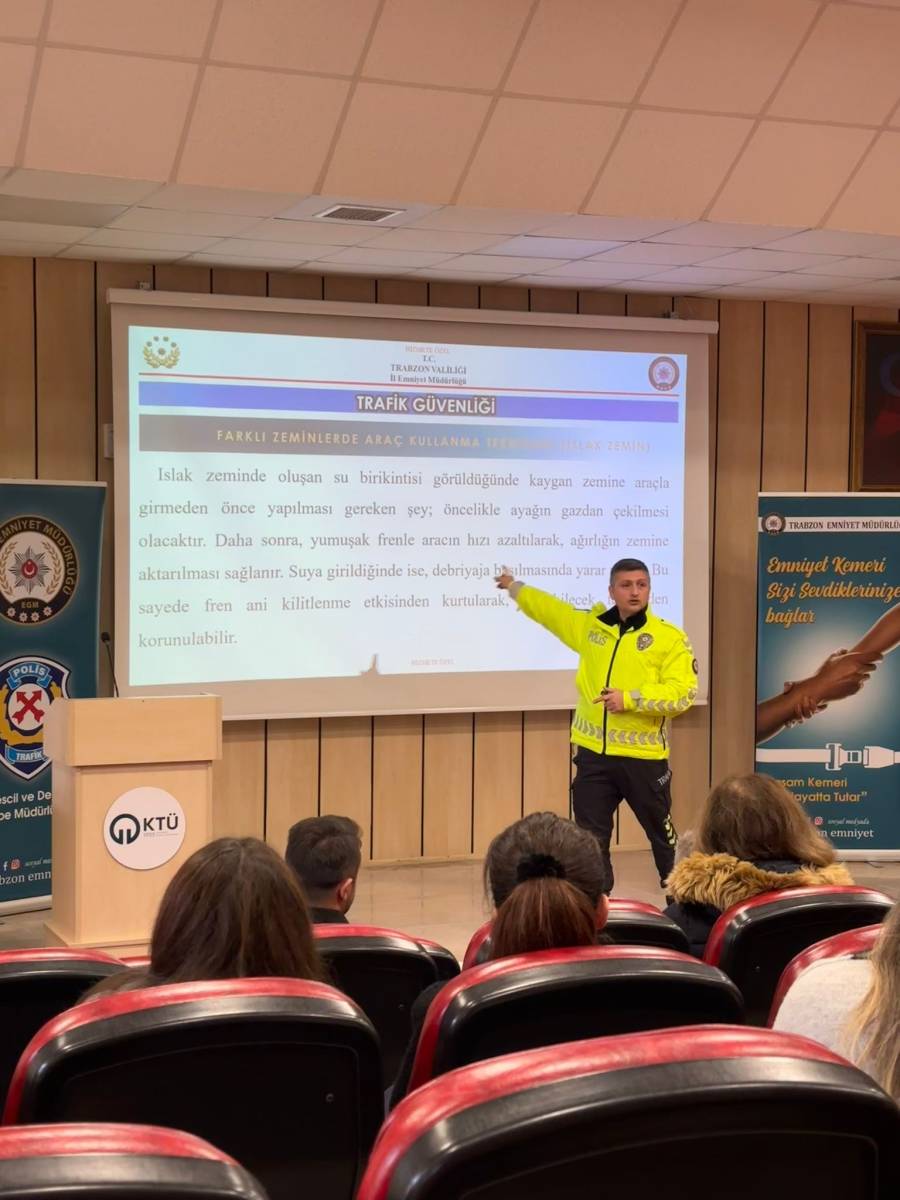 Üniversitemiz Memur Akademisi tarafından yürütülen farkındalık ve kurumsal gelişim faaliyetleri kapsamında düzenlenen “Trafik Güvenliği” konulu eğitim programı KTÜ Fen Fakültesi Nazım Terzioğlu Amfisinde gerçekleştirildi. Programa, Trabzon İl Emniyet Müdürlüğü’nde görev yapan polis memuru Recep Özgür ÇOBAN eğitmen olarak katıldı. Eğitimde, trafik güvenliği konusunda temel kavramlar, yasal düzenlemeler ve günlük hayatta karşılaşılan riskler kapsamlı biçimde ele alındı.