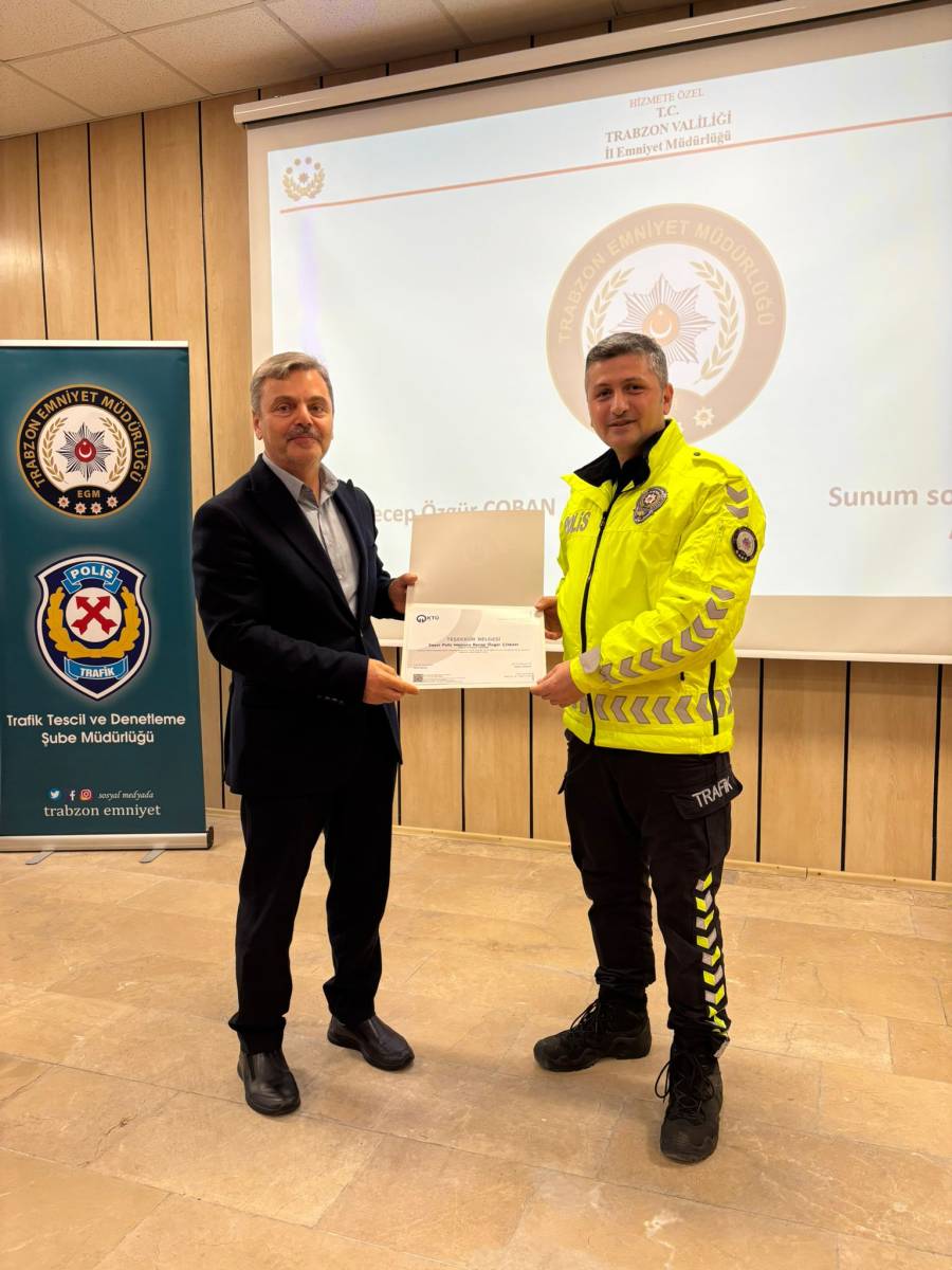 Eğitim programı, katkı ve paylaşımlarından dolayı Trabzon İl Emniyet Müdürlüğü’nde görev yapan polis memuru Recep Özgür ÇOBAN’a, Planlama Eğitim ve Performans Şube Müdürü Öğr. Gör. Mustafa TONYALI tarafından teşekkür belgesi takdim edilmesiyle sona erdi.