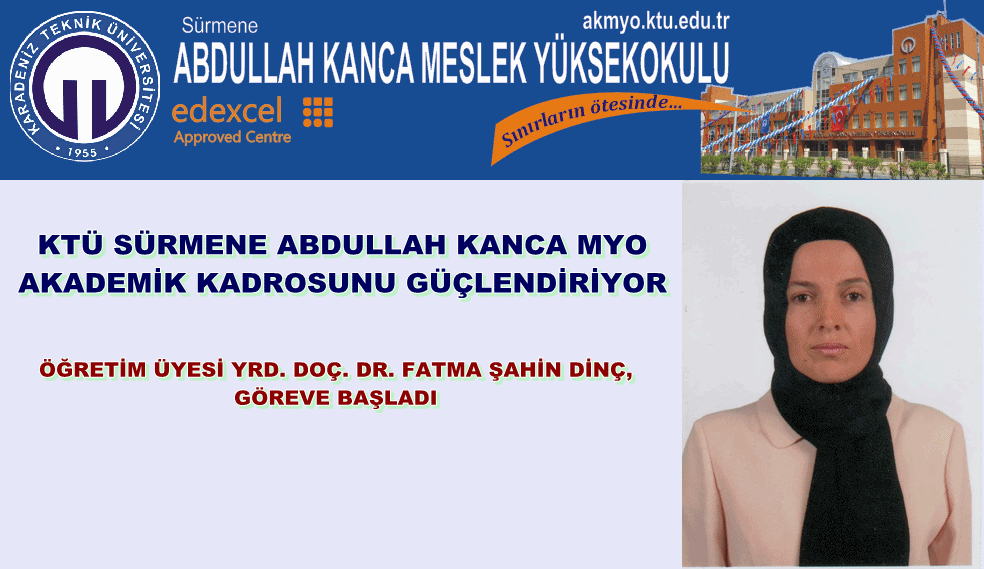 Marmara Üniversitesi İngilizce Fizik Öğretmenliği Lisans mezunu olan, Yüksek Lisans ve Doktorasını da aynı üniversitede tamamlayan Yrd. Doç. Dr. Fatma Şahin Dinç, KTÜ Sürmene Abdullah Kanca Meslek Yüksek Okulumuz Makine ve Metal Teknolojileri Bölümü Makine Anabilim Dalı 1.Derece Yardımcı Doçent kadrosuna atanarak göreve başladı. Daha önce Milli Eğitim Bakanlığı’na bağlı çeşitli okullarda görev yapan Yrd. Doç. Dr. Fatma Şahin Dinç’in ulusal ve uluslararası sempozyum vb. Akademik toplantılarda sunulmuş ve yayımlanmış birçok makalesi, Enstitü Müdürlüğü, İl Milli Eğitim Müdürlüğü ve Kaymakamlık tarafından verilmiş çok sayıda takdir ve teşekkür belgesi bulunmaktadır.