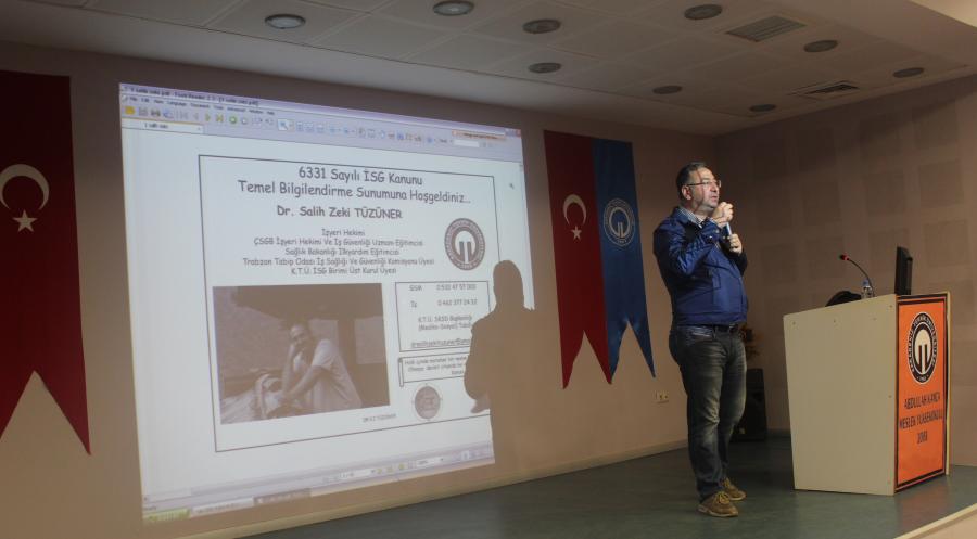KTÜ Sürmene Abdullah kanca Meslek Yüksekokulumuz konferans salonunda 6331 Sayılı İş Sağlığı ve Güvenliği Kanunu yasa kapsamında 08.00-12.00/13.00-17.00 saatleri arasında Sürmene AKMYO, Deniz Bilimleri Fakültesi ve Deniz Bilimleri Muammer Dereli Kampusu Akademik ve İdari personellerine İş Güv. Uzm. Öğr. Gör. Onur ÖZKAYA ve Aile Hekimi Dr. Ömer ÇEBİ tarafından "Zorunlu Temel İş Sağlığı ve Güvenliği Eğitimi" verildi.