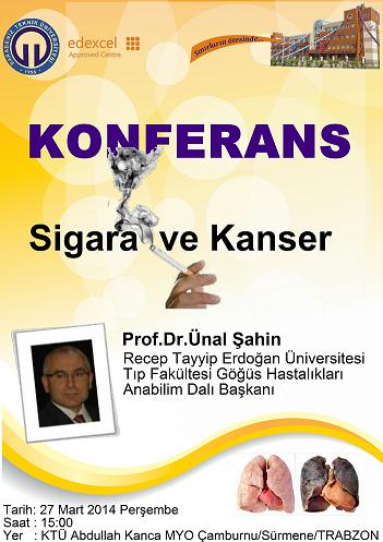 KTÜ Sürmene Abdullah Kanca MYO Müdürlüğümüzde “Sigara ve Kanser” konulu konferans düzenlendi. Recep Tayyip Erdoğan Üniversitesi Tıp Fakültesi Göğüs Hastalıkları Anabilim Dalı Başkanı Prof. Dr. Ünal Şahin tarafından verilen konferansta, sigaranın insan sağlığı üzerindeki etkileri, sigara şirketlerinin faaliyetleri ve gençleri etkilemeye çalışmaları konularında güncel bilgiler verildi.