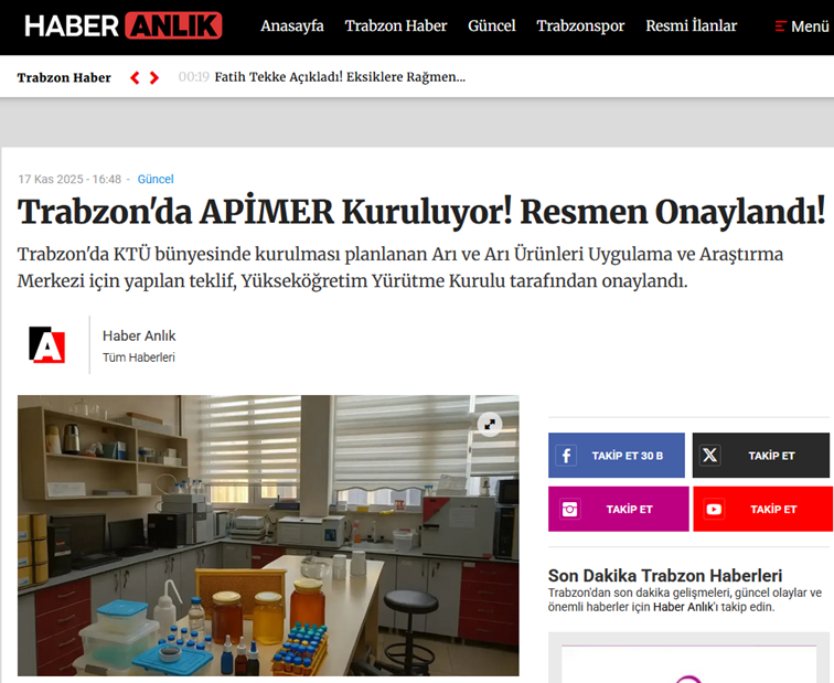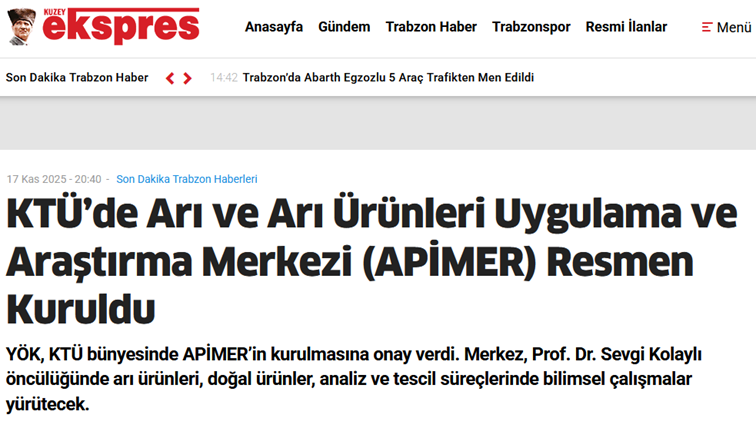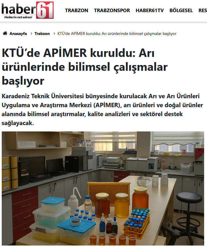 KTÜ Arı ve Arı Ürünleri Uygulama ve Araştırma Merkezi’nin (APİMER) kuruluşu, yerel ve ulusal düzeyde farklı gazete ve yayın organlarında yer buldu. Merkezin kuruluş sürecine ilişkin haberler, basın aracılığıyla kamuoyuna aktarılırken, APİMER’in arı ve arı ürünleri alanında yürütmeyi hedeflediği çalışmalar da genel hatlarıyla paylaşılmıştır. APİMER olarak, kuruluş sürecimize gösterilen ilgi ve desteğin, merkezin tanınırlığına ve faaliyetlerinin daha geniş kitlelere ulaşmasına katkı sağlayacağı değerlendirilmektedir.
