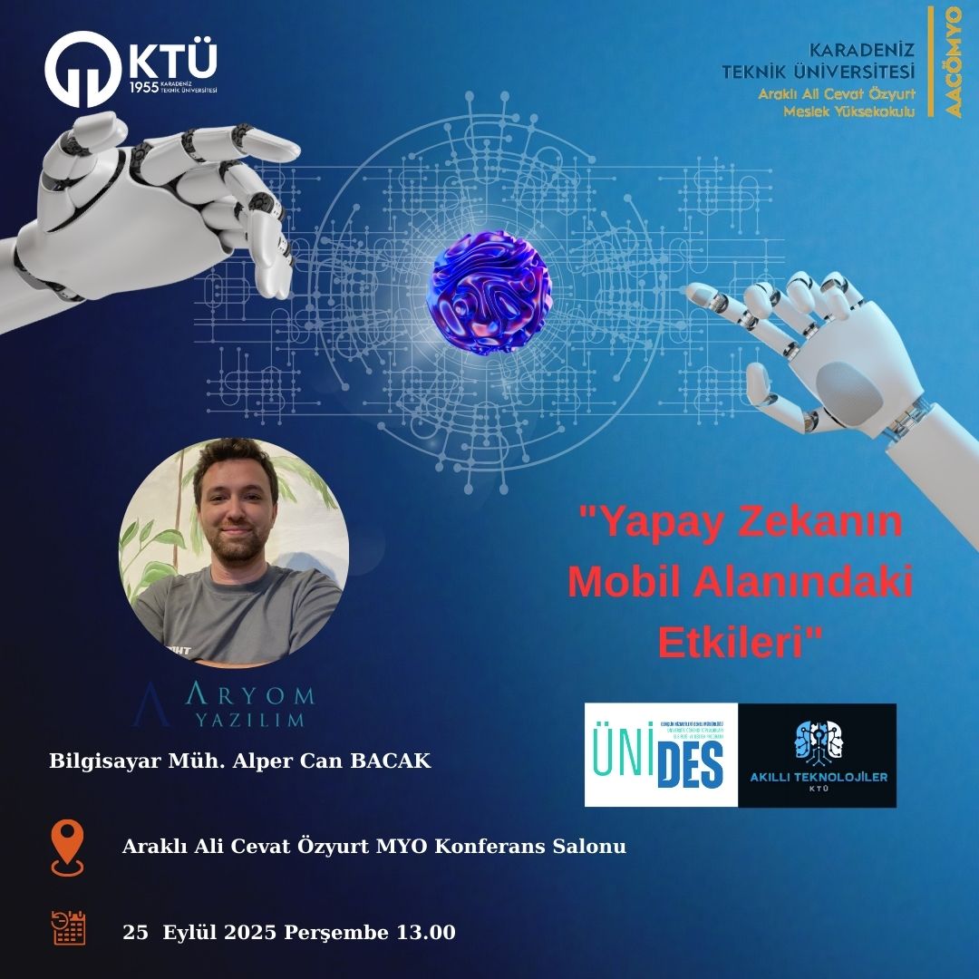 Akıllı Teknolojiler Kulübü öğrencilerinin T.C. Gençlik ve Spor Bakanlığı Üniversite Öğrenci Toplulukları İş Birliği ve Destek Programı (ÜNİDES) "Yapay Zekanın Mobil Alanındaki Etkileri" isimli projeleri kabul olmuştur. Bu proje kapsamında 25 Eylül 2025 Perşembe günü saat:13:00 da Aryom Yazılım'dan Alperen Can BACAK'ın katılımıyla konferans yapılacaktır. Bütün öğrencilerimiz davetlidir.