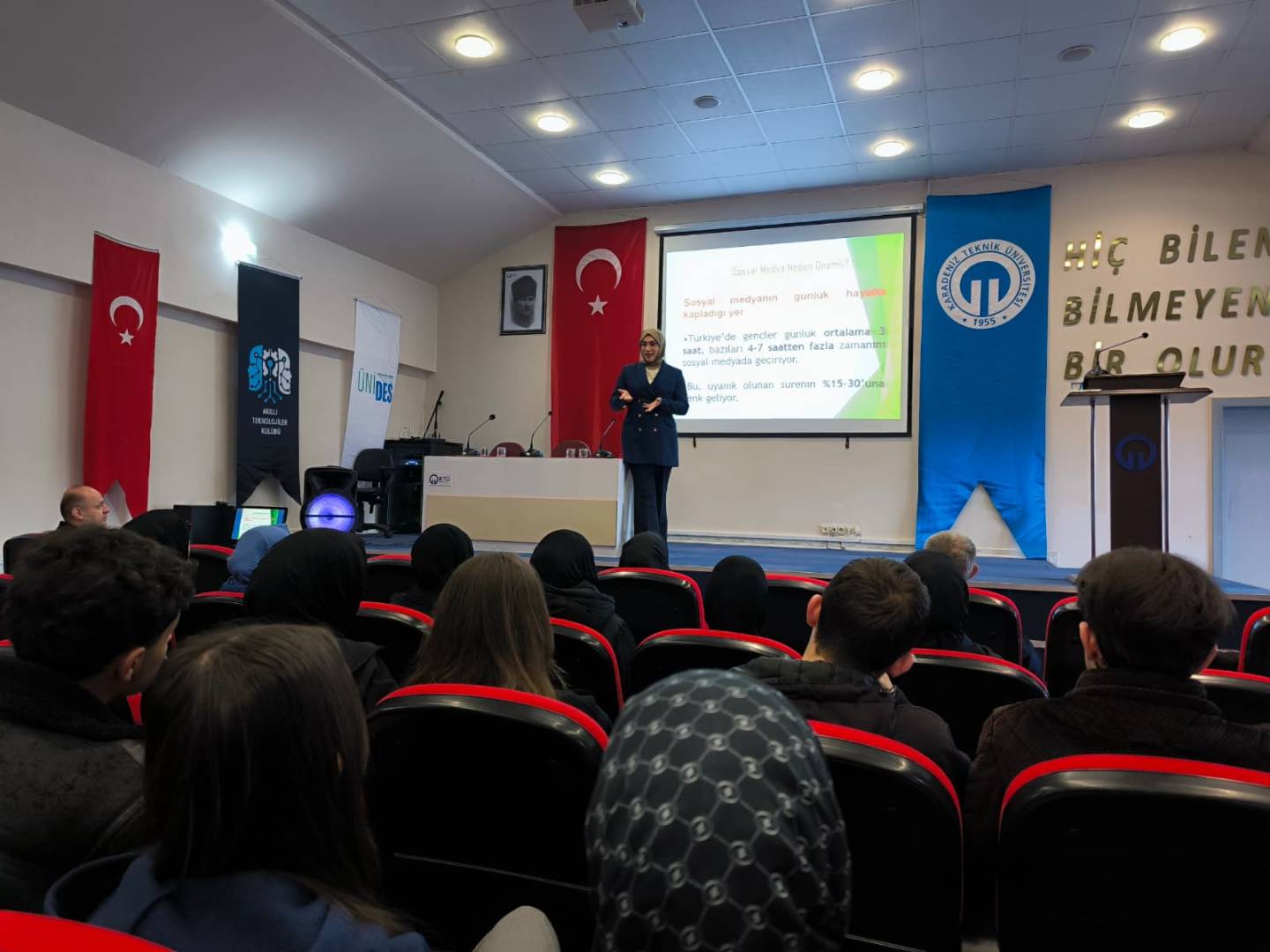 “Sosyal Medyada Gerçekler ve Ben” konulu sosyal sorumluluk projemiz kapsamında bu hafta Yomra Hacı Hakkı Çalış AİHL öğrencileriyle bir araya geldik. Program kapsamında öğrencilerle birlikte Yüksekokulumuzun bölümleri, derslikleri ve yeni açılan laboratuvarları gezdik. Öğrenciler bölümlere yoğun ilgi gösterdi ve merak ettikleri konularda sorular yönelttiler. Ardından Öğretim Görevlimiz Didem ÇAKIR tarafından konferans gerçekleştirildi. Sunumun sonunda öğrencilerin soruları yanıtlandı.