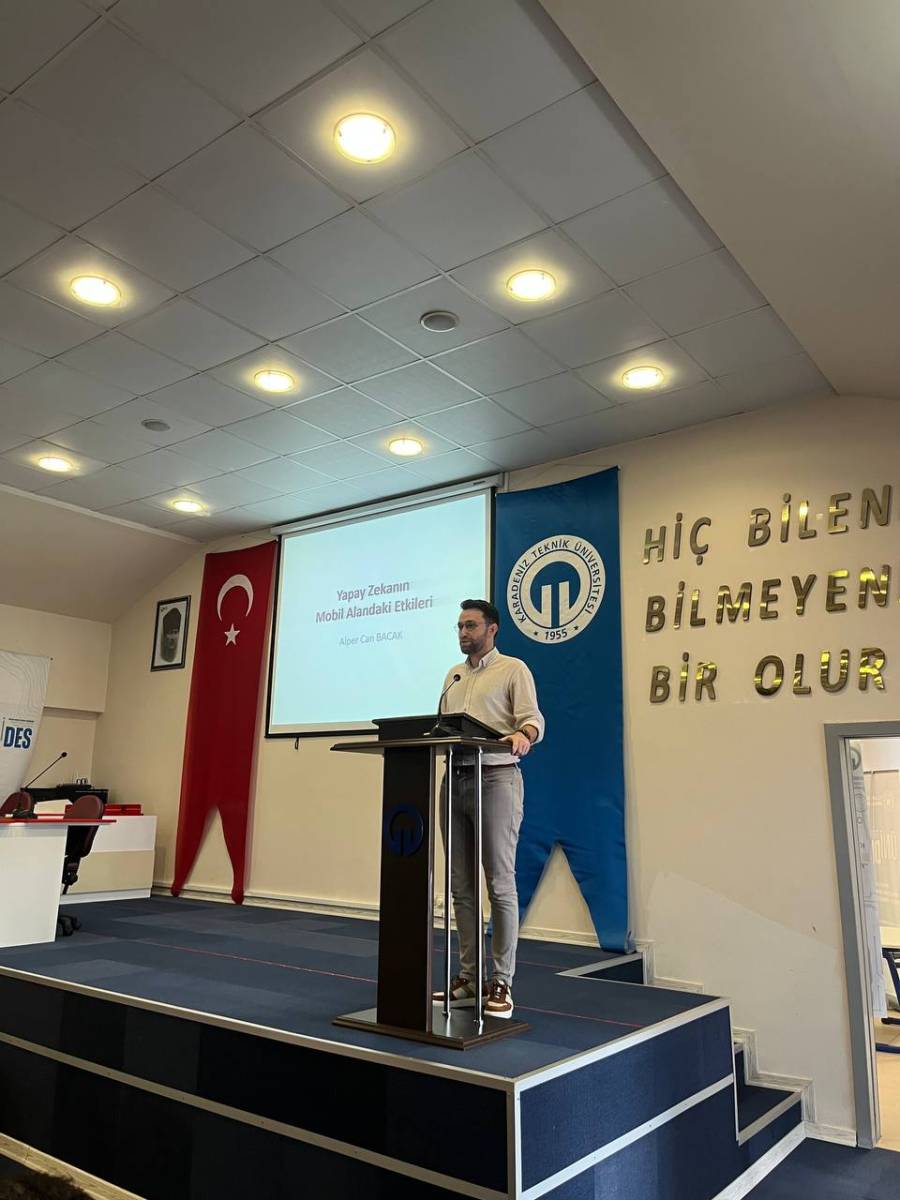 Konferansın konuşmacısı Aryom Yazılım’dan Alperen Can Bacak, yapay zekânın mobil alanındaki gelişmeleri, günlük yaşama etkilerini ve gelecekte bizleri bekleyen yenilikleri aktardı. Öğrencilerin dikkatle takip ettiği sunumun ardından, Alperen Bey katılımcıların yoğun ilgi gösterdiği soruları yanıtladı ve öğrencilerle kısa bir sohbet gerçekleştirdi.