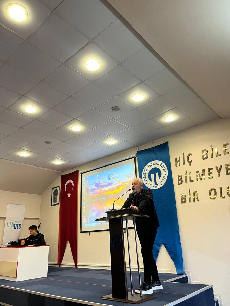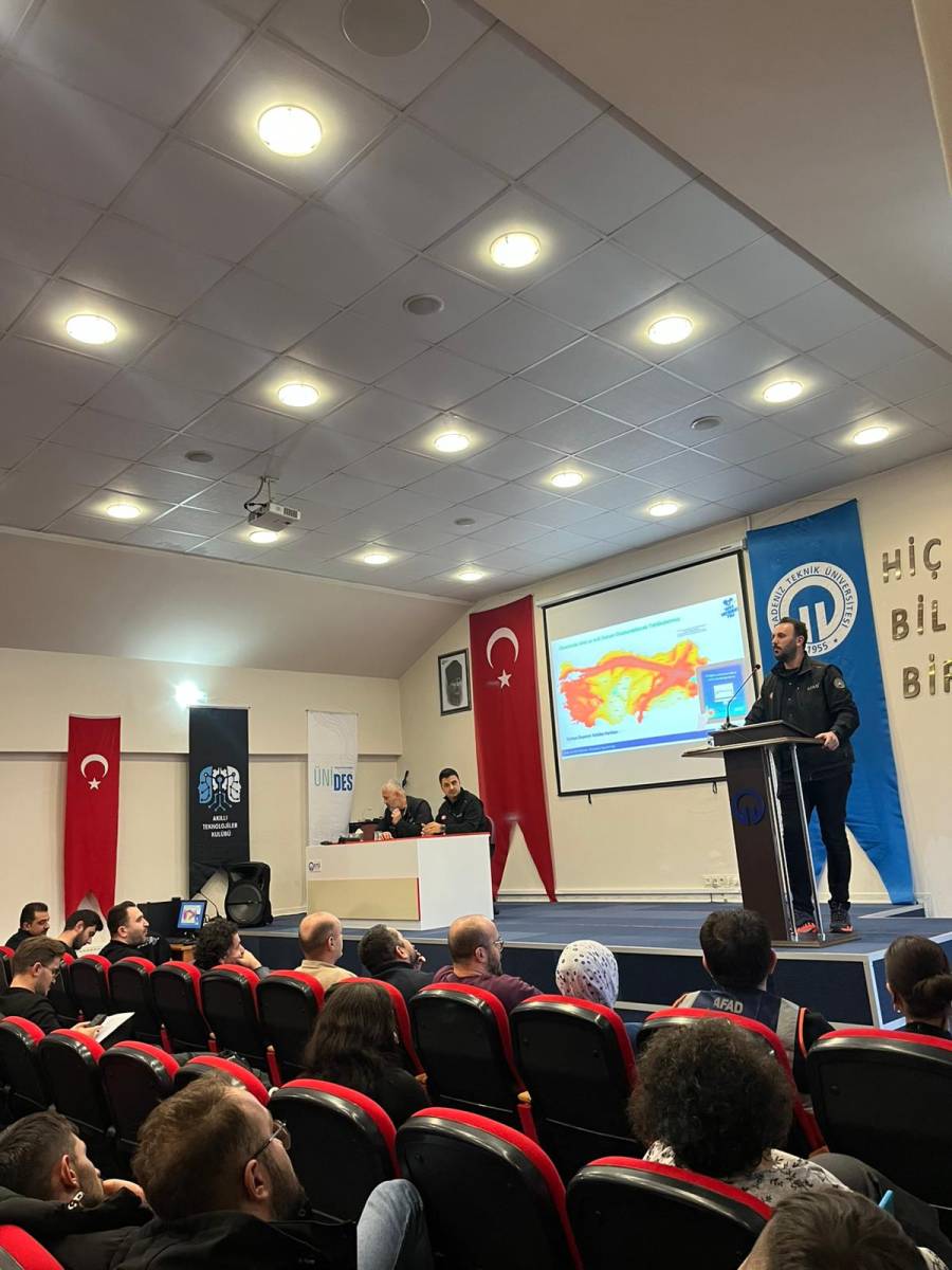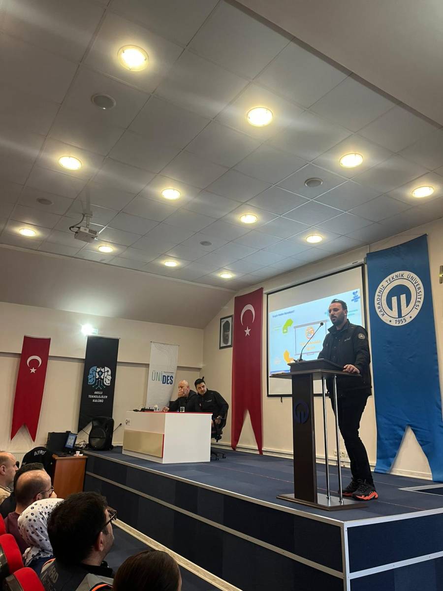 11 Aralık 2025 tarihinde Meslek Yüksekokulumuz konferans salonunda AFAD Trabzon İl Müdürlüğü tarfından "Afet Farkındalık Eğitimi" gerçekleştirildi. Eğitim Şube Müdürü Tolga MUSLU, Eğitim Uzmanı M.Önder BAYTAR ve Arama ve Kurtarma Şefi Erkan AKPINAR tarafından "Afet Farkındalık Eğitimi", "Afad Gönüllülük Sistemi" ve "Arama Kurtarma Faaliyetleri" konu başlıkları hakkında bilgilerin verildiği etkkinliğe öğrencilerimiz yoğun katılım sağladı. Öğrencilerin sık sık soru ve yorumları ile katkıda bulunduğu etkinliğin sonunda Yükseokulumuz Müdürü Prof. Dr. Özcan ÖZYURT ve Mülkiyet Koruma ve Güvenlik Bölüm Başkanı Öğr. Gör. Dr. Ahmet Cem ESENLİKCi tarafından katılımcılara plaket ve teşekkür belgesi takdim edildi.