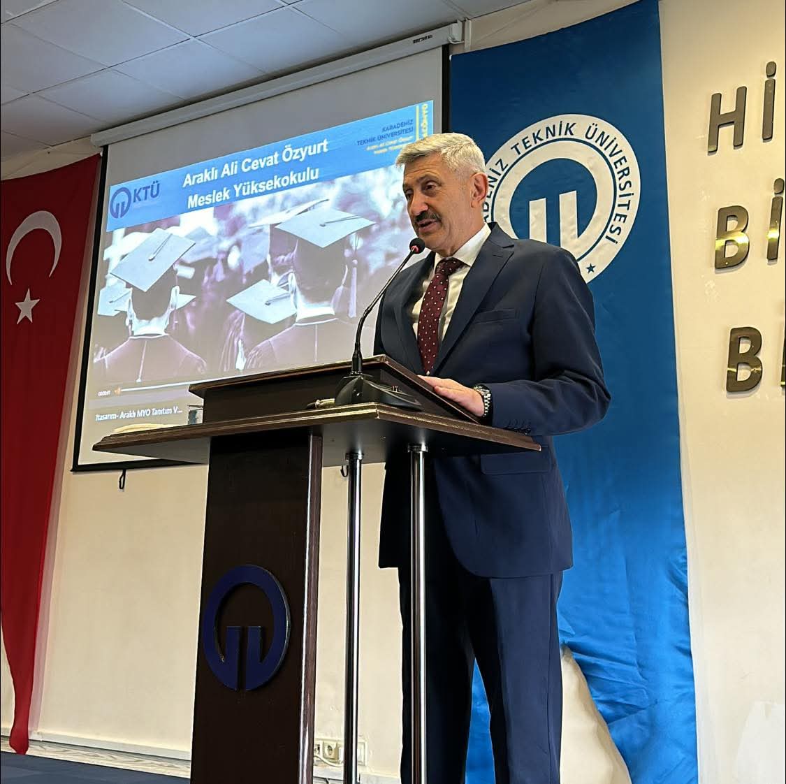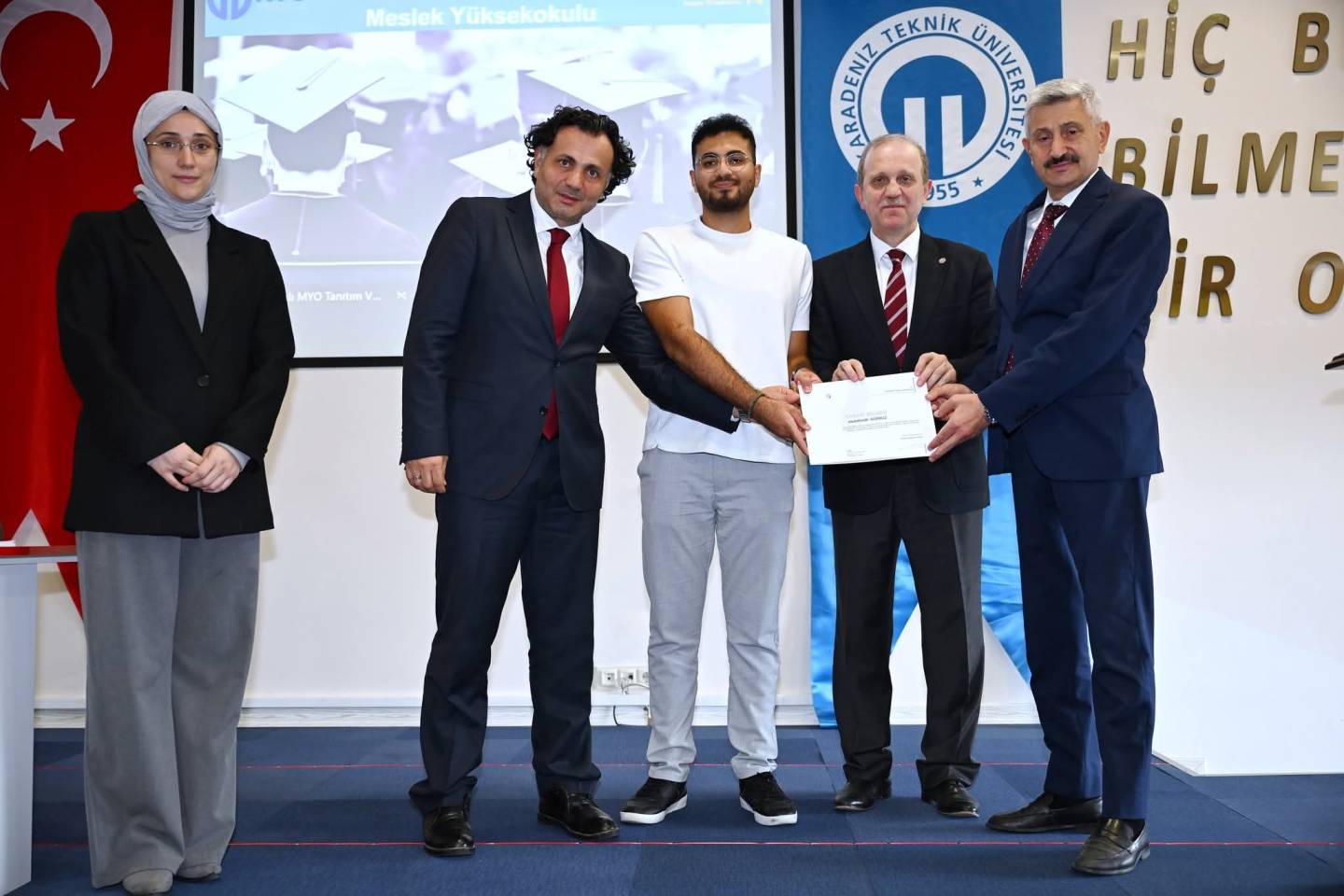 Etkinlikte ayrıca, TEKNOFEST 2025 Türkçe Doğal Dil İşleme Yarışması Senaryo Kategorisi’nde KTÜ Al-F1 Takımı ile üniversitemizi temsil ederek Türkiye 3.’sü olan Yapay Zekâ Operatörlüğü Programı 2. sınıf öğrencimiz Abdulkadir GÜRBÜZ’e başarı belgesi takdim edildi. Belge, Rektörümüz Prof. Dr. Hamdullah ÇUVALCI, Meslek Yüksekokulu Müdürümüz Prof. Dr. Özcan ÖZYURT ve Araklı Belediye Başkanı Hüseyin Avni Coşkun ÇEBİ tarafından verildi.