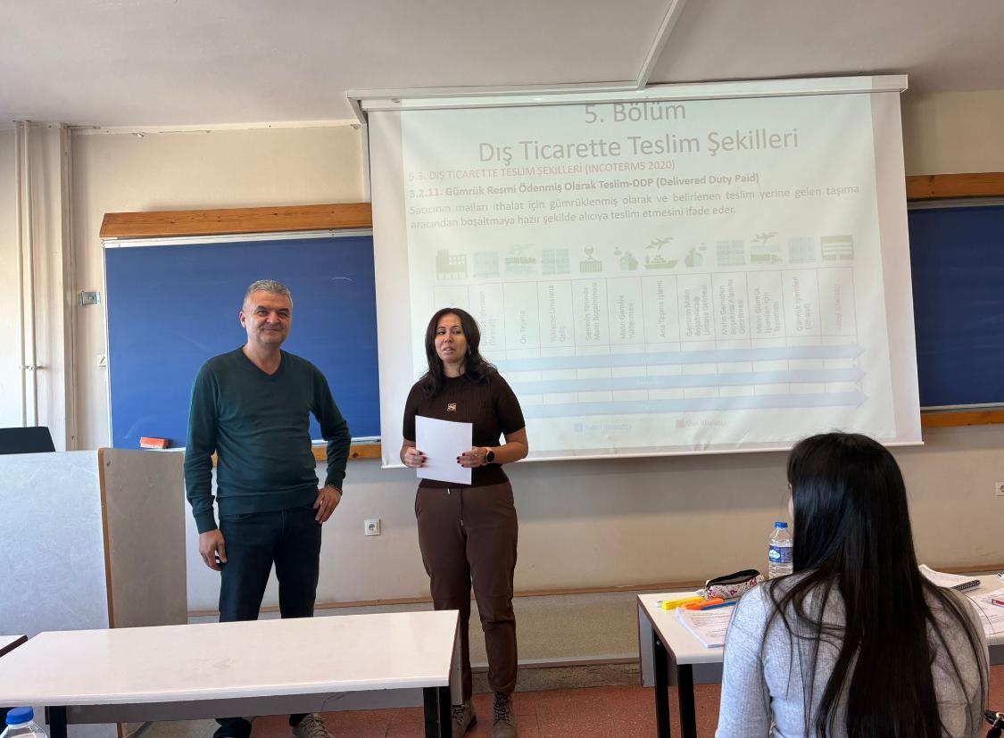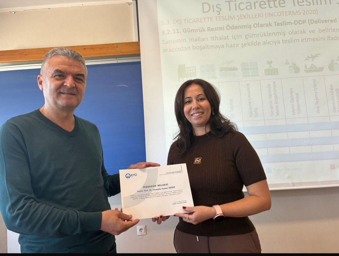 Yönetim ve Organizasyon Bölüm Başkan Yardımcısı Öğr. Gör. Sevgi DEĞER'in Lojistik Programı 2. Sınıf öğrencilerine yönelik organize ettiği "Fakültede Ders Dinleme Deneyimi" etkinliği Yönetim ve Organizasyon Bölüm Başkanı Öğr. Gör. Dr. Damla EKER'in de katılımıyla KTÜ İİBF İktisat Bölümünde gerçekleştirildi. Etkinlik kapsamında İktisat Bölümü Öğretim Üyesi Prof. Dr. M. Kemal DEĞER’in yürütücüsü olduğu 4. Sınıf seçmeli derslerinden Dış Ticaret İşlemleri dersine konuk dinleyici olarak katılım sağlandı.