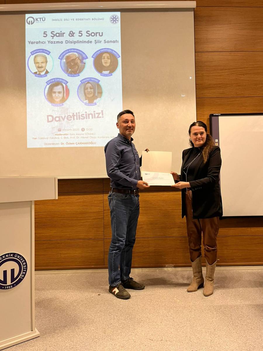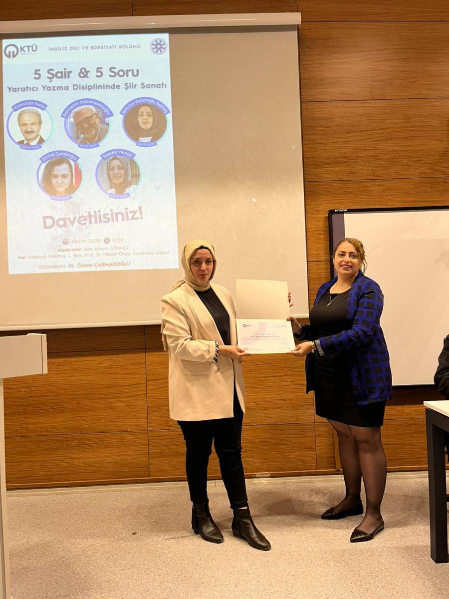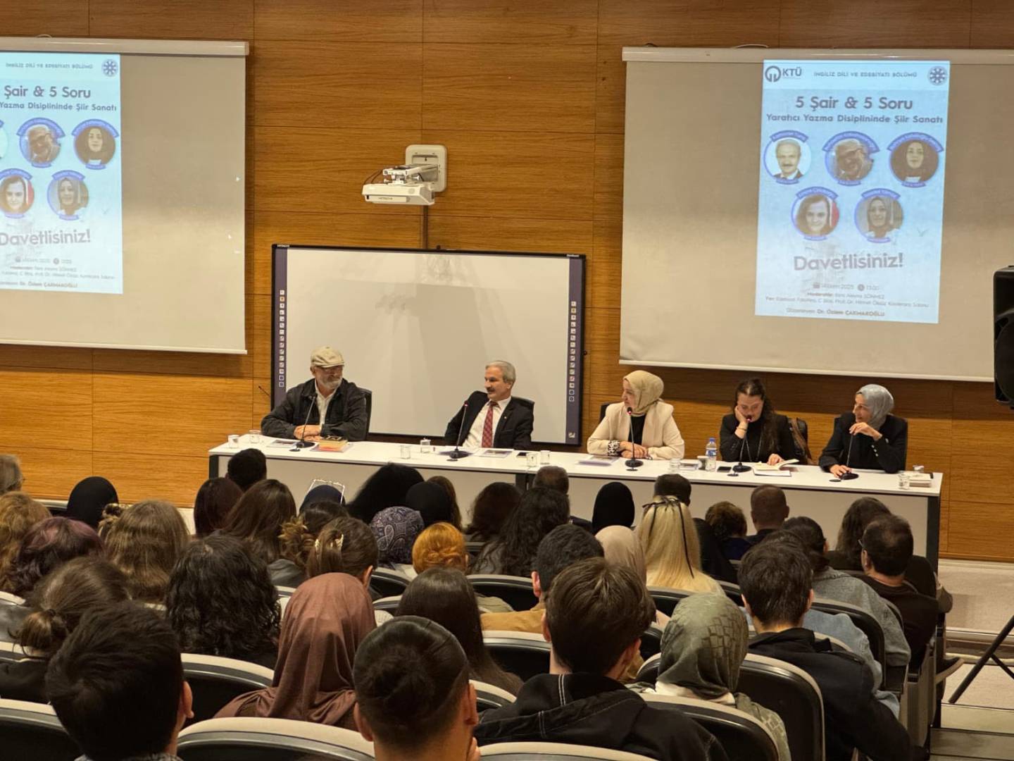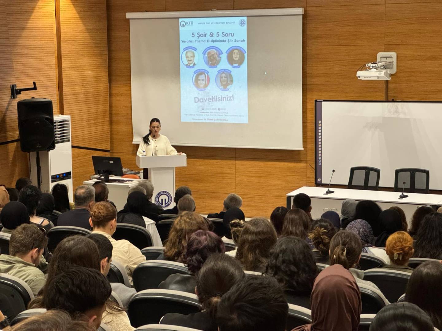ELL3027 İngiliz Şiiri dersi kapsamında bölüm araştırma görevlilerinden Dr. Özlem Çakmakoğlu tarafından, teorik bilgiyi yaratıcı uygulamalarla pekiştirmek amacıyla “5 Şair & 5 Soru: Yaratıcı Yazma Disiplininde Şiir Sanatı” başlıklı bir etkinlik düzenlendi. Etkinliğe, Trabzon yerel şairlerinden Kamuran Tuna, Bahaettin Kabahasanoğlu, Bahriye Kefelioğlu Bektaş, Emine Çolakoğlu ve Saadet Yılmaz konuşmacı olarak katıldı. Açılış konuşmalarını Doç. Dr. Nazan Yıldız Çiçekçi'nin yaptığı panelde, şiirin yaratım süreci, bireysel deneyimlerin edebi metne dönüşümü, yazma disiplini ve ilham kavramı gibi konular derinlemesine ele alındı. Bölüm başkanı Prof. Dr. M. Naci Kayaoğlu panelistlere, geçtiğimiz yıl yine bölümümüz tarafından Türkiye çapında düzenlenen şiir yarışması sonucunda kitaplaştırılmış "Bütün Çocuklar Masumdur" başlıklı Gazze'ye ve masumiyete ithaf edilen şiir kitabını hediye etti. Etkinlik, şiir yazmaya ilgi duyan ve hâlihazırda bu alanda üretim yapan öğrencilerin motivasyonlarını artırmayı, teknik bilgi birikimlerini derinleştirmeyi ve yazma sürecinde karşılaştıkları sorulara yanıt bulmalarını kolaylaştırmayı amaçladı.