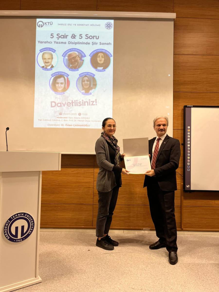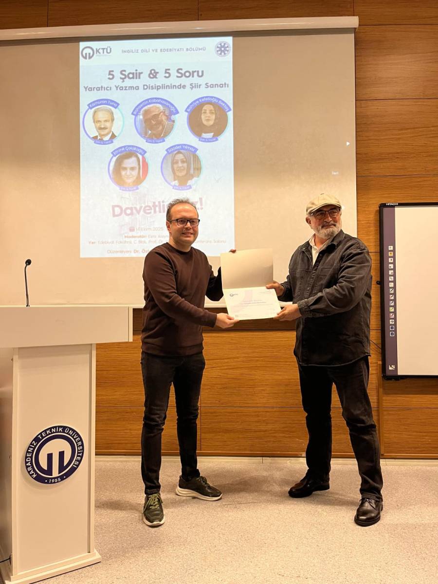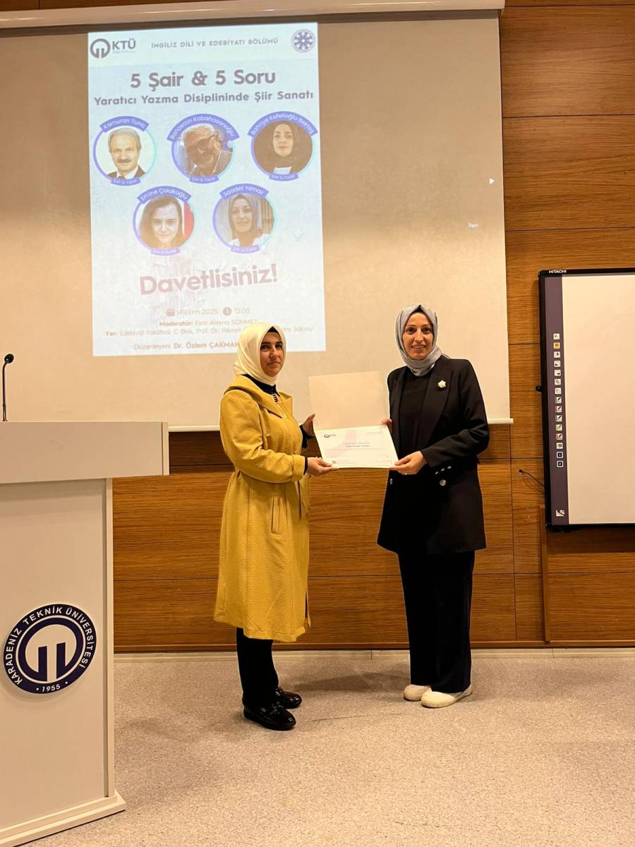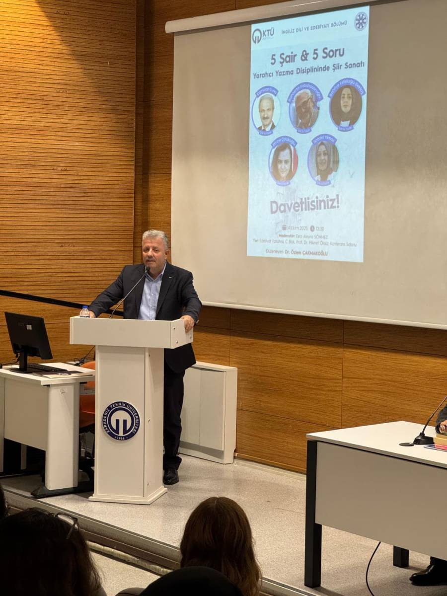 ELL3027 İngiliz Şiiri dersi kapsamında bölüm araştırma görevlilerinden Dr. Özlem Çakmakoğlu tarafından, teorik bilgiyi yaratıcı uygulamalarla pekiştirmek amacıyla “5 Şair & 5 Soru: Yaratıcı Yazma Disiplininde Şiir Sanatı” başlıklı bir etkinlik düzenlendi. Etkinliğe, Trabzon yerel şairlerinden Kamuran Tuna, Bahaettin Kabahasanoğlu, Bahriye Kefelioğlu Bektaş, Emine Çolakoğlu ve Saadet Yılmaz konuşmacı olarak katıldı. Açılış konuşmalarını Doç. Dr. Nazan Yıldız Çiçekçi'nin yaptığı panelde, şiirin yaratım süreci, bireysel deneyimlerin edebi metne dönüşümü, yazma disiplini ve ilham kavramı gibi konular derinlemesine ele alındı. Bölüm başkanı Prof. Dr. M. Naci Kayaoğlu panelistlere, geçtiğimiz yıl yine bölümümüz tarafından Türkiye çapında düzenlenen şiir yarışması sonucunda kitaplaştırılmış "Bütün Çocuklar Masumdur" başlıklı Gazze'ye ve masumiyete ithaf edilen şiir kitabını hediye etti. Etkinlik, şiir yazmaya ilgi duyan ve hâlihazırda bu alanda üretim yapan öğrencilerin motivasyonlarını artırmayı, teknik bilgi birikimlerini derinleştirmeyi ve yazma sürecinde karşılaştıkları sorulara yanıt bulmalarını kolaylaştırmayı amaçladı.