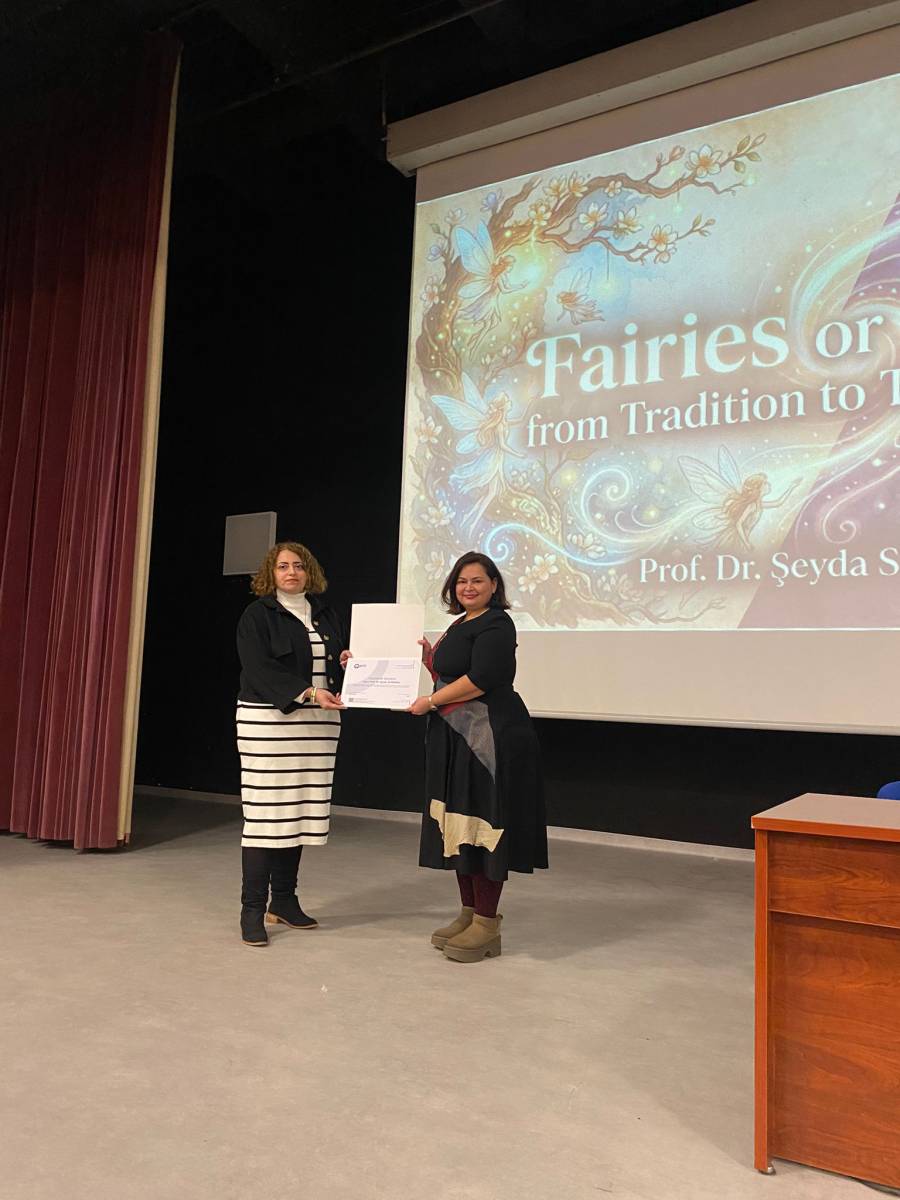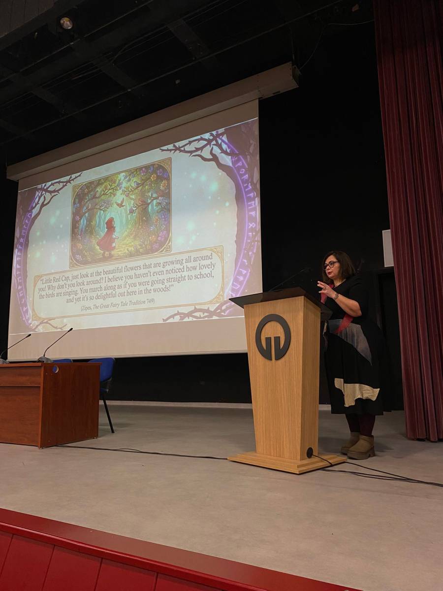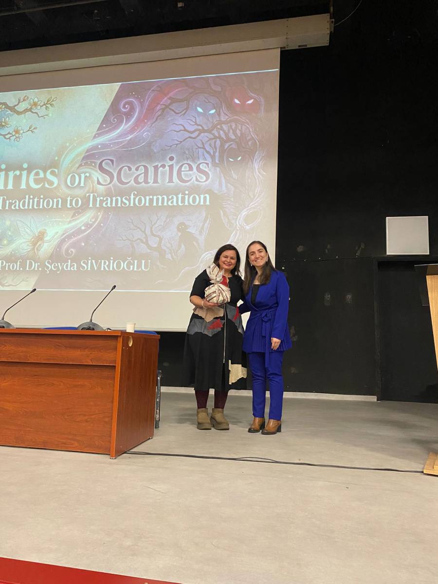 “FAIRIES OR SCARIES? From Tradition to Transformation: Challenging Grand Narratives of Fairy Tales” başlıklı seminerde Prof. Dr. SİVRİOĞLU, masalların geleneksel anlatı yapılarının zaman içinde nasıl dönüştüğünü ele aldı. Sunumda masalların yalnızca çocuk edebiyatına ait metinler olarak değil; toplumsal, kültürel ve ideolojik boyutları olan anlatılar olarak okunabileceği üzerinde duruldu.