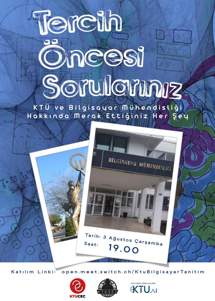 3 Ağustos 2022 Saat 19.00 Tarihinde bölüm kulüplerimiz KTÜ Bilgisayar Mühendisliği Öğrenci Kulübü, KTÜ Siber Güvenlik Kulübü ve KTÜ Yapay Zeka Kulübü ortaklığında, tercih döneminde KTÜ Bilgisayar Mühendisliği bölümünü tercih edecek arkadaşlarımıza bölümümüzü tanıtmak ve sorularına daha kolay yanıt bulabilmelerini sağlamak adına “Soru-Cevap” etkinliğini gerçekleştireceğiz. Bölümümüzü daha iyi tanımak, imkanları, görmek ve merak ettiklerinizi sormak için etkinliğimize davetlisiniz.