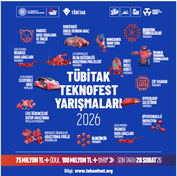 Yarışmalar kapsamında takımlara maddi destek sağlanmakta; başarılı bulunan takımlara ödüller verilmektedir. Detaylı bilgilere TEKNOFEST'in resmî internet sitesi üzerinden (www.teknofest.org) ulaşılabilmekte olup başvurular 20 Şubat 2026 tarihine kadar devam etmektedir. Genç insan kaynağımızın bilgi, beceri ve çalışma azmini artırarak "Millî Teknoloji Hamlesi" kapsamında ülkemizi bilim ve teknoloji alanında hedeflerine ulaştırmayı amaç edinen TEKNOFEST, oluşturduğu heyecan ile sahip olduğumuz güçlü potansiyeli ortaya çıkarmaktadır.