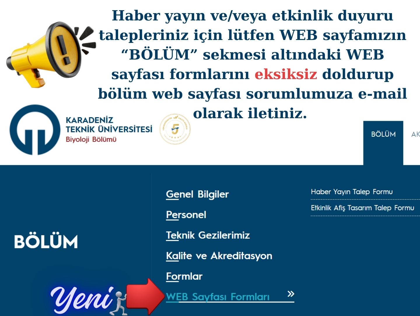 • 09.03.2026 Bölümümüz Web Sayfasında yayın akışının iyileştirilmesi kapsamında iki(2) yeni form (Haber Yayın Talep Formu ve Etkinlik Afiş Tasarım Formu) hazırlanarak bölümümüz WEB sayfasına eklenmiştir.