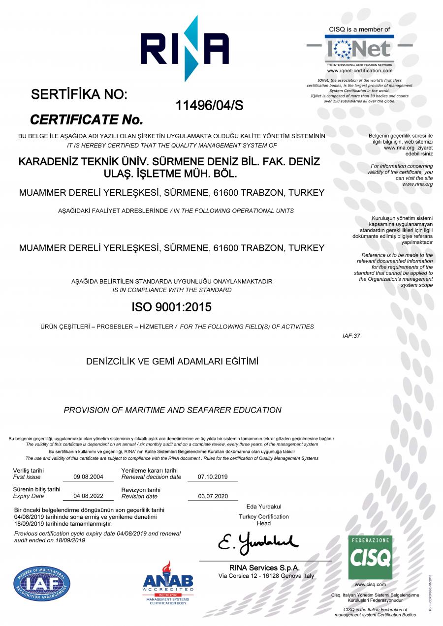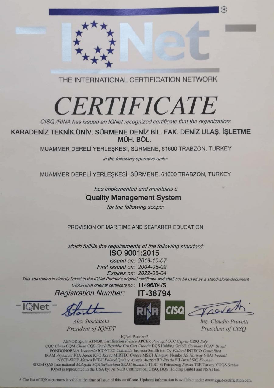 Üniversitemiz, Sürmene Deniz Bilimleri Fakültesi Deniz Ulaştırma İşletme Mühendisliği Bölümünün "Denizcilik ve Gemiadamları Eğitimi" alanında uygulamakta olduğu Kalite Yönetim Sistemi, 15.09.2021 tarihinde, uluslararası akreditasyon kuruluşu RINA tarafından yapılan ISO 9001:2015 denetimini başarıyla tamamlamıştır.
