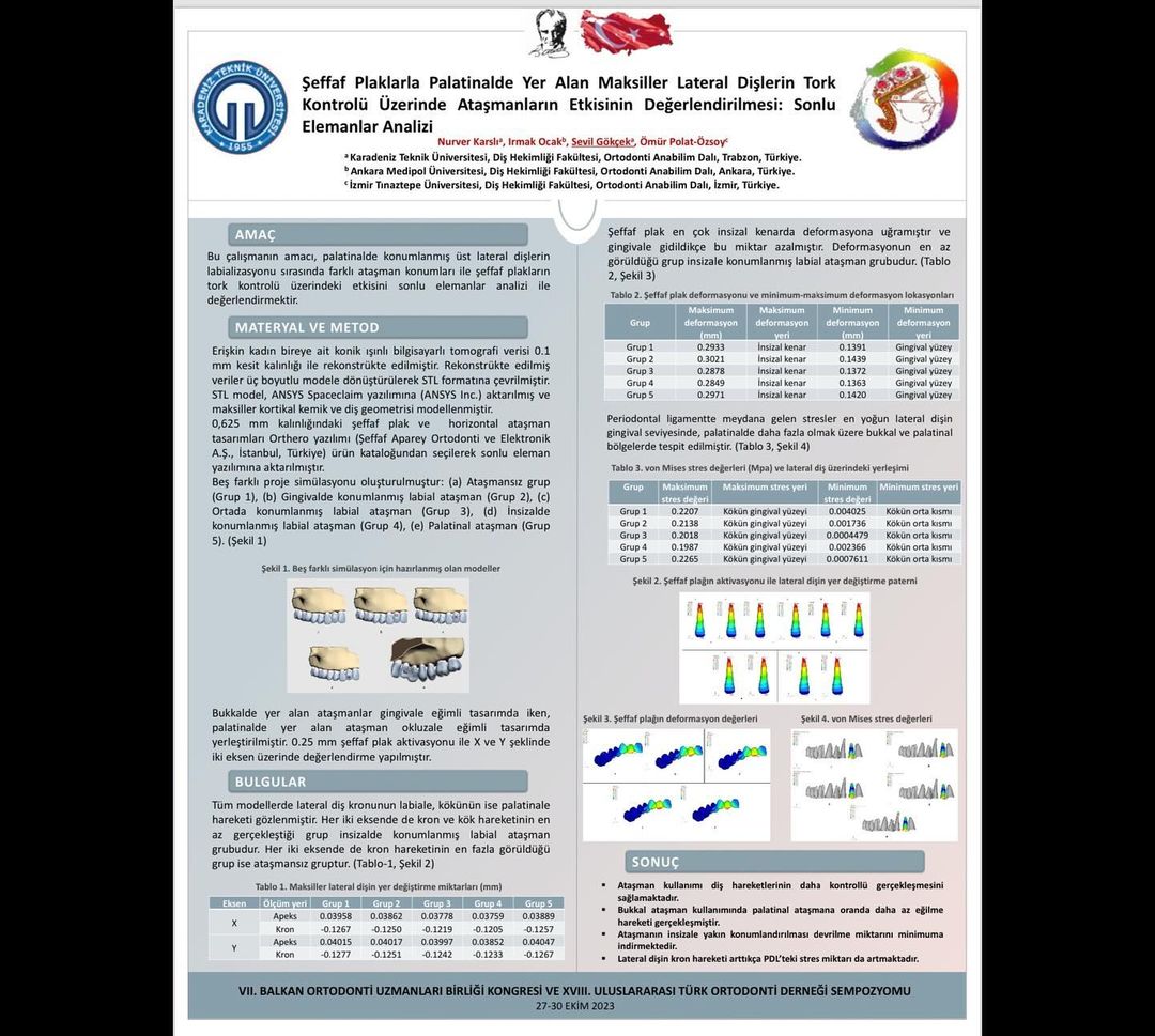 27-30 Ekim 2023 tarihleri arasında İstanbul’da düzenlenen 18. Uluslararası Türk Ortodonti Derneği Sempozyum’unda Fakültemiz Ortodonti Anabilim Dalı akademisyenlerinden Dr. Öğr. Üyesi Nurver KARSLI ile Arş. Gör. Dt. Sevil GÖKÇEK “Şeffaf Plaklarda Palatinalde Yer alan Maksiller Lateral Dişlerin Tork Kontrolü Üzerinde Ataşmanların Etkisinin Değerlendirilmesi: Sonlu Elemanlar Analizi” başlıklı poster sunumları ile 2.’lik ödülü kazanmışlardır. Kendilerini tebrik eder, başarılarının devamını dileriz…