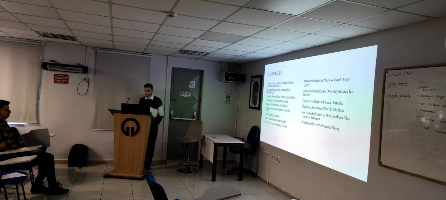 Fakültemiz “SEC 209 İnsan İlişkileri ve İletişimi” dersi içeriğinde, Dönem 2 öğrencilerimize yönelik kapsamlı bir eğitim programı düzenlenmiştir. Ders yürütücüsü Öğr. Gör. Dr. Taner BAŞFIRINCI'nın moderatörlüğünü üstlendiği etkinliğe davetli konuşmacı olarak katılan Psikolog Yasin VURAL, diş hekimliği pratiğinde karşılaşılabilecek psikolojik süreçler üzerine bir sunum gerçekleştirmiştir.