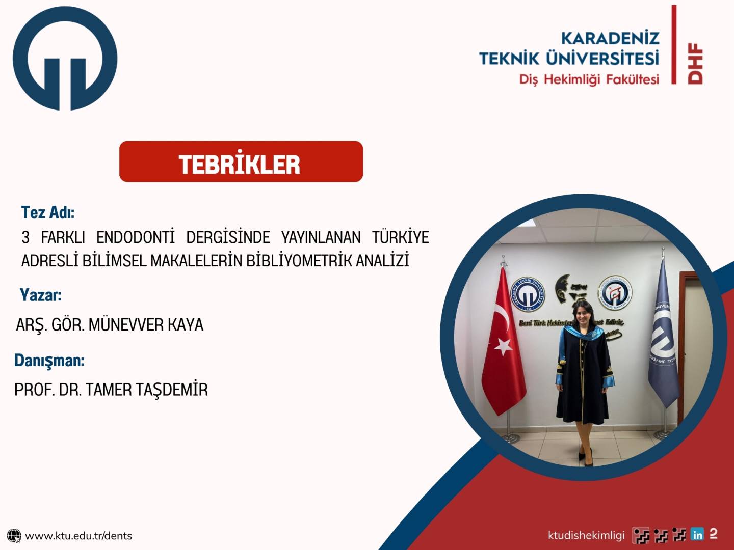 Fakültemiz Klinik Bilimler Bölümü Endodonti Anabilim Dalı Öğretim Elemanı Arş. Gör. Dt. Münevver KAYA'nın Tez Çalışması