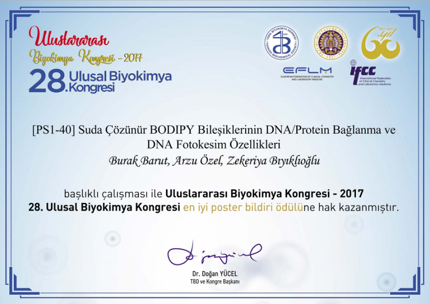 Aynı Kongrede Eczacılık Fakültesi Biyokimya Anabilim Dalı'ndan Arş. Gör. Burak BARUT, Yrd. Doç. Dr. Arzu ÖZEL ve Doç. Dr. Zekeriya BIYIKLIOĞLU’ndan oluşan ekip "[PS1-40] Suda çözünür BODIPY Bileşiklerinin DNA/Protein Bağlanma ve DNA Fotokesim Özellikleri" başlıklı araştırmaları ile en iyi poster bildiri ödülünü aldılar.