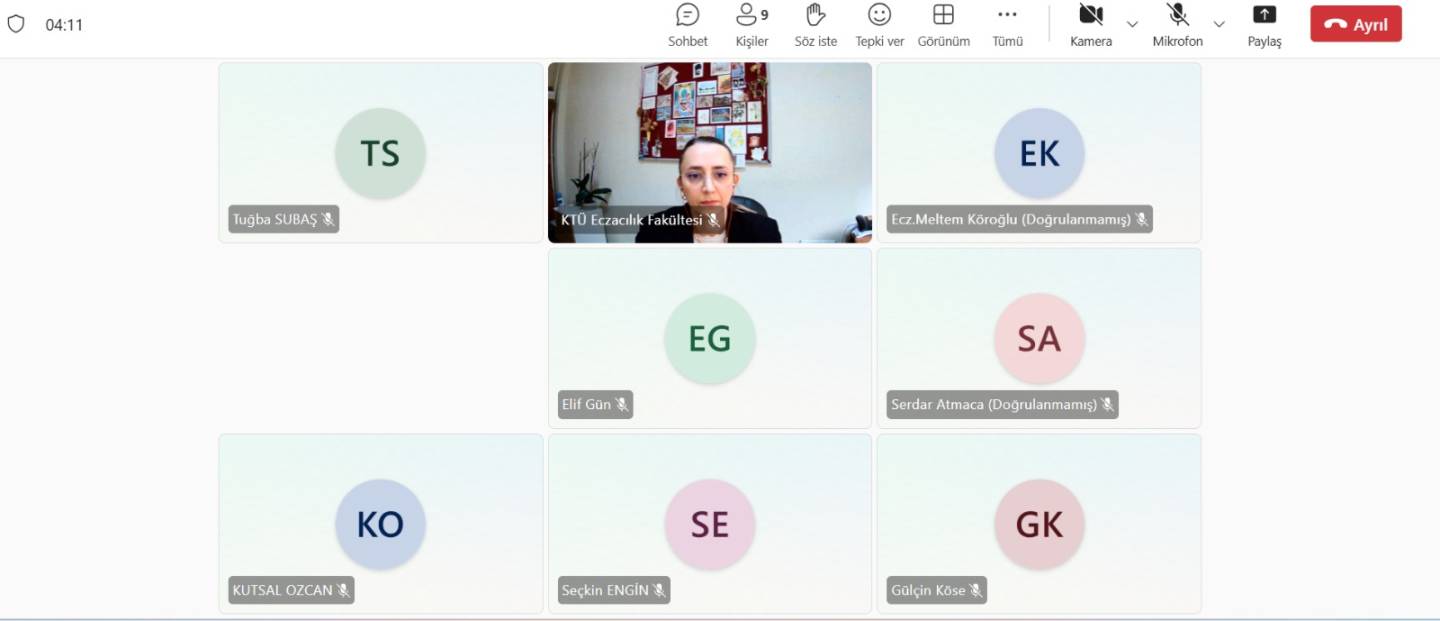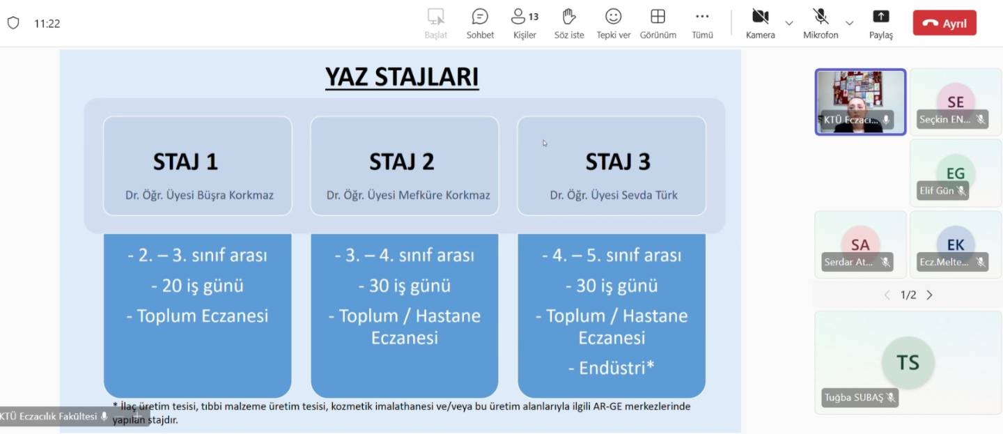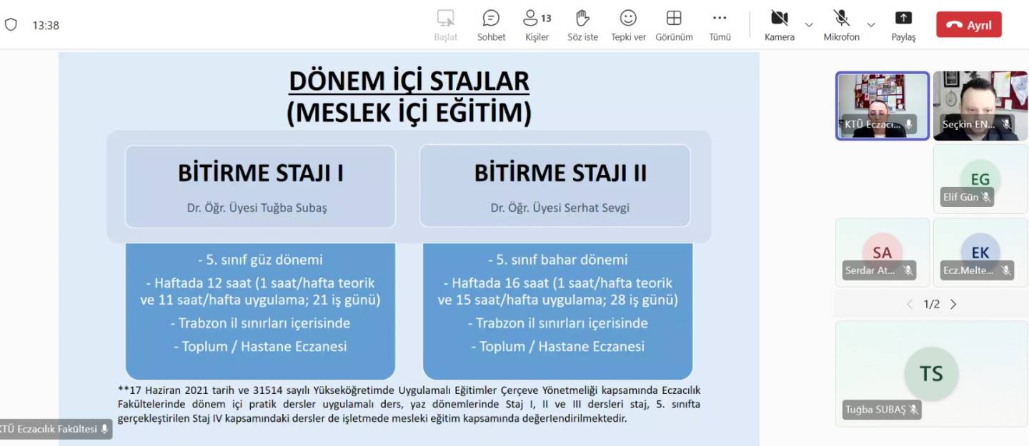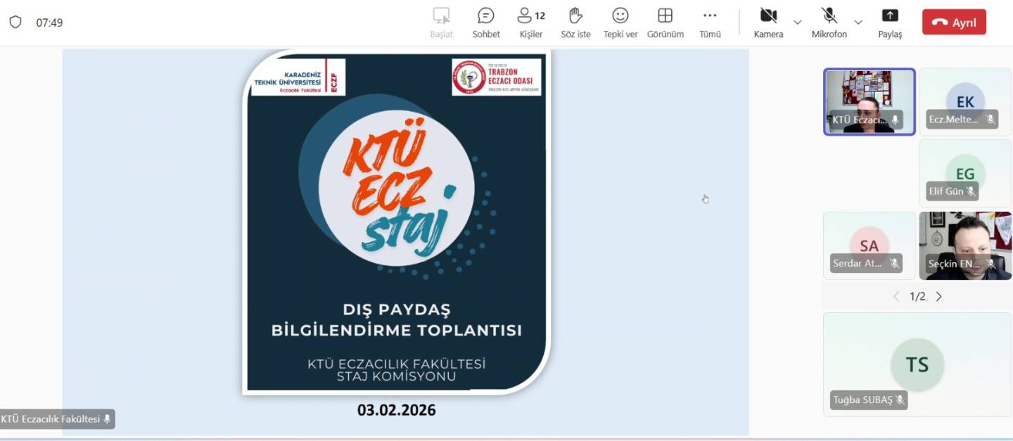 3 Şubat 2026 tarihinde çevrim içi olarak yapılan toplantıya Fakültemiz Staj Komisyonu Başkanı Dr. Öğr. Üyesi Nurdan YAZICI, Staj Koordinatörü öğretim üyelerimiz ve 18. Bölge Trabzon Eczacı Odası üyesi değerli meslektaşlarımız katılım sağladı. Toplantıda staj uygulamalarına ilişkin genel çerçeve, beklentiler ve sorumluluklar, sahadaki geri bildirimler ve karşılaşılan durumlar ve iyileştirme önerileri başlıklarında fikir alışverişi yapıldı.