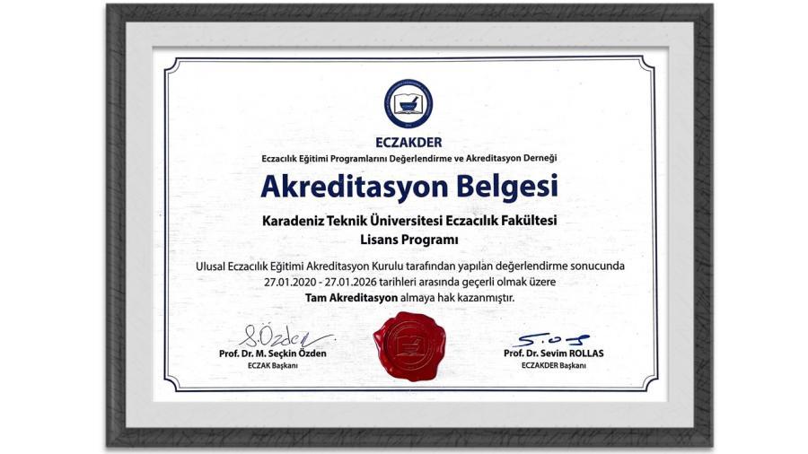 Karadeniz Teknik Üniversitesi Eczacılık Fakültesi, 10.01.2018 tarihinde başvuru yaparak başlatmış olduğu Akreditasyon sürecini Ulusal Eczacılık Eğitimi Akreditasyon Kurulu (ECZAK)’nun Eczacılık Eğitimi Programlarını Değerlendirme ve Akreditasyon Derneği (ECZAKDER)’nin değerlendirmeleri sonucunda tamamlamış olup, 27.01.2020 tarihinden itibaren 6 (altı) yıl süre “Tam Akreditasyon” almaya hak kazanmıştır.