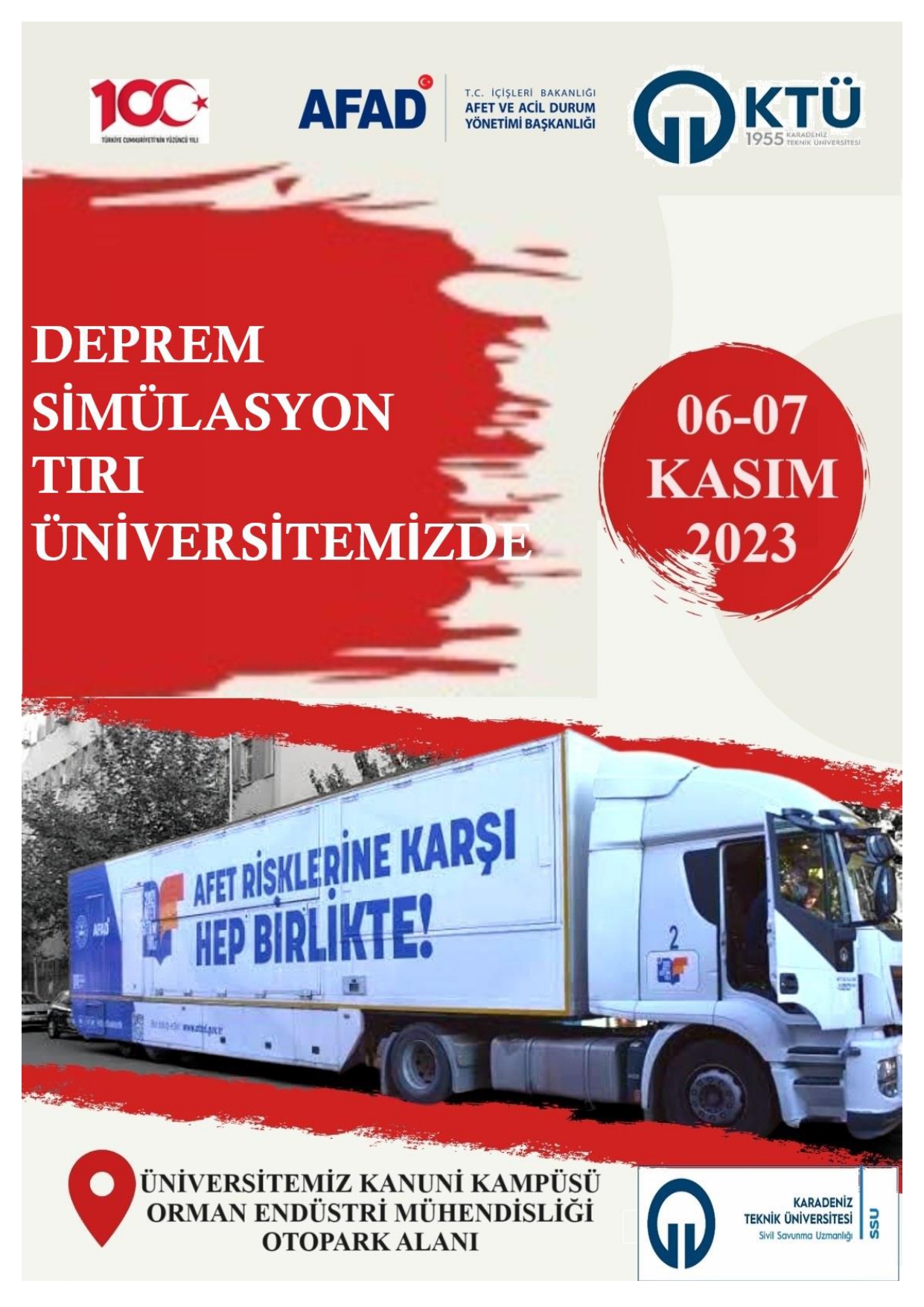 AFAD' a ait Deprem Similasyon Tırı Ünivertsitemizde Öğrencilerimize Deprem hakkında bilgiler verecek olup deprem anında yapılması gerekenleri uygunlamalı olarak gösterilecektir. Bu 2 günlük süreçte sizleri ORman Endüstri Mühendisliği Otopark Alanında karşılayacaktır.