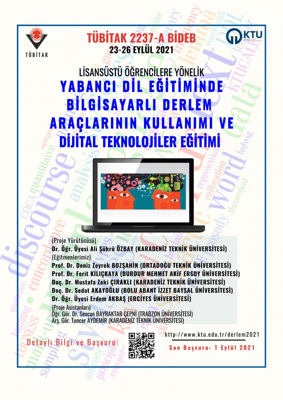 2237-A Bilimsel Eğitim Etkinlikleri Desteği (TÜBİTAK) kapsamında kabul edilen “LİSANSÜSTÜ ÖĞRENCİLERE YÖNELİK YABANCI DİL EĞİTİMİNDE BİLGİSAYARLI DERLEM ARAÇLARININ KULLANIMI VE DİJİTAL TEKNOLOJİLER EĞİTİMİ”. 23-26 Eylül, 2021 tarihleri arasında üniversitemiz de online olarak yapılacak olup, projemize yurt genelinde 30 farklı üniversitenin İngiliz Dili Eğitimi ve İngiliz Dili ve Edebiyatı alanlarında lisansüstü eğitim yapan öğrenciler başvurmuştur. Başvurular arasından kriterlere uygun 30 aday eğitim almak üzere seçilmiştir.