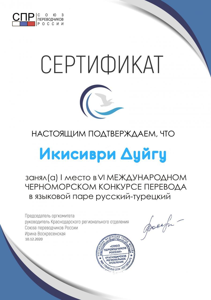 Bölümümüzün öğretim elemanlarından Arş. Gör. Duygu İkisivri, Rusya Çevirmenler Birliği'nin Krasnodar Bölge Şubesi (Краснодарскoe региональнoe отделение Союзa переводчиков России) tarafından düzenlenen VI. Uluslararası Karadeniz Deniz Sanatı Çeviri Yarışmasında (VI международный черноморский конкурс перевода маринистики) sanatsal düzyazı, şiir ve Karadeniz'in ekolojik sorunlarına dikkat çekilen bilimsel makale olmak üzere üç alanda Rusçadan Türkçeye çeviri kategorisinde birincilik elde etmiştir. Kendisini tebrik eder, başarılarının devamını dileriz.