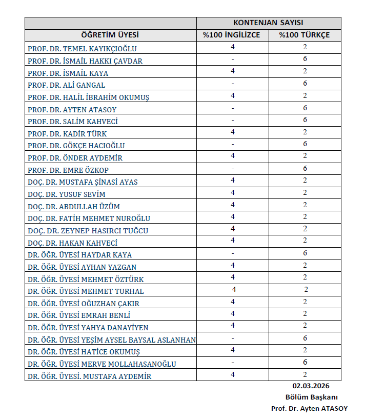 Aşağıdaki tabloda Öğretim Üyelerimizin %100 İngilizce ve %100 Türkçe programlarında danışman olarak alacakları öğrenci kontenjanı verilmiştir.