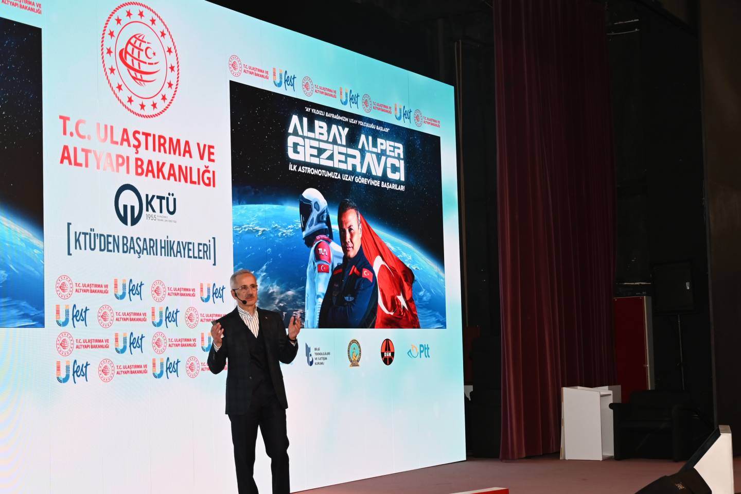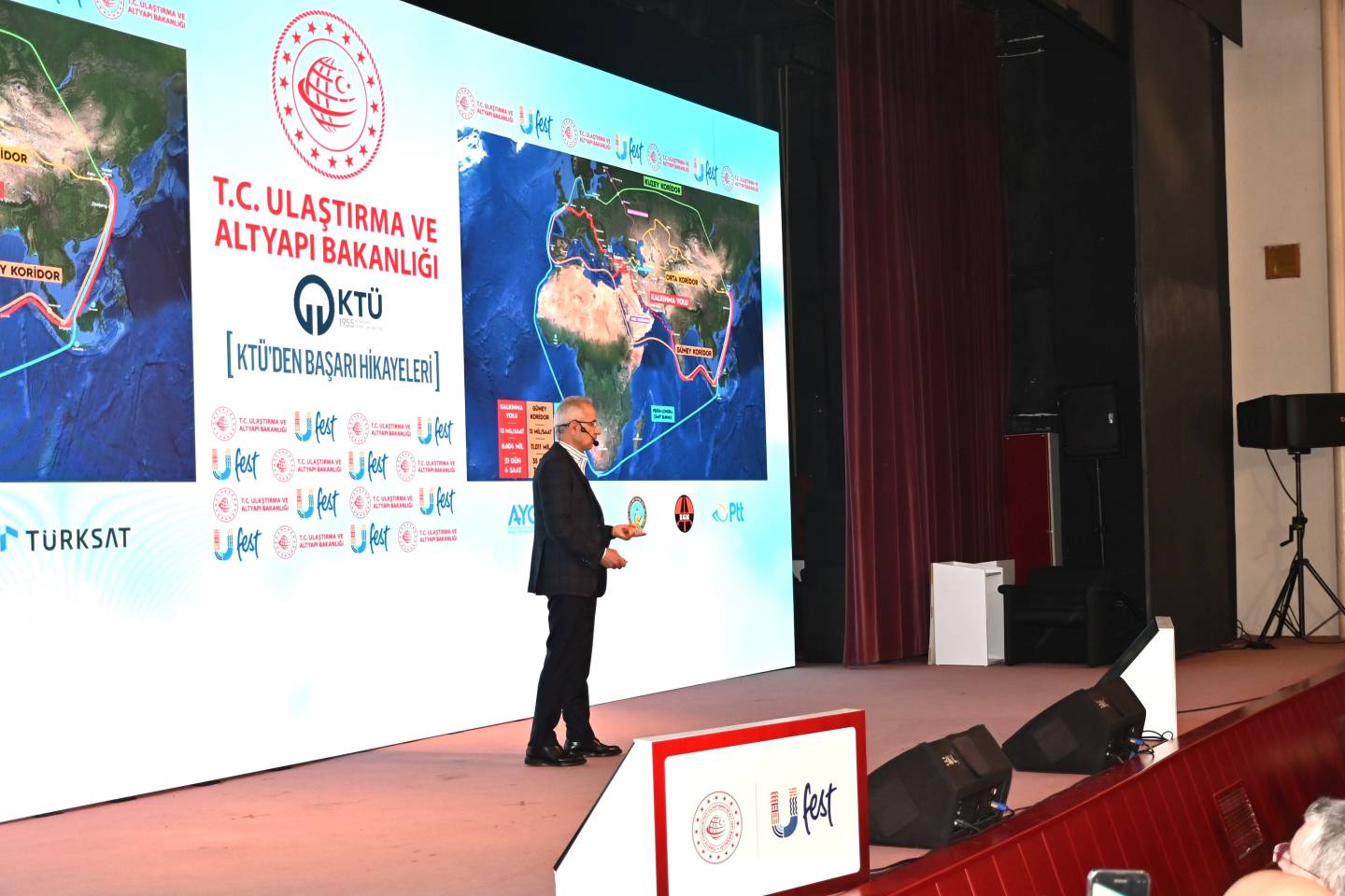 Rector Prof. Dr. Hamdullah Çuvalcı emphasized the significance of being the first university to host the U-Fest, an event aimed at bringing together professionals and stakeholders from the transportation and infrastructure sectors to build a sustainable and innovative future in collaboration with young minds. He expressed gratitude to the Ministry of Transport and Infrastructure and Minister Abdulkadir Uraloğlu for organizing and bringing the festival to our university. He said, "We are honored to host Minister Abdulkadir Uraloğlu, who shared his knowledge, expertise, practices, and experiences with our esteemed students here at KTU."