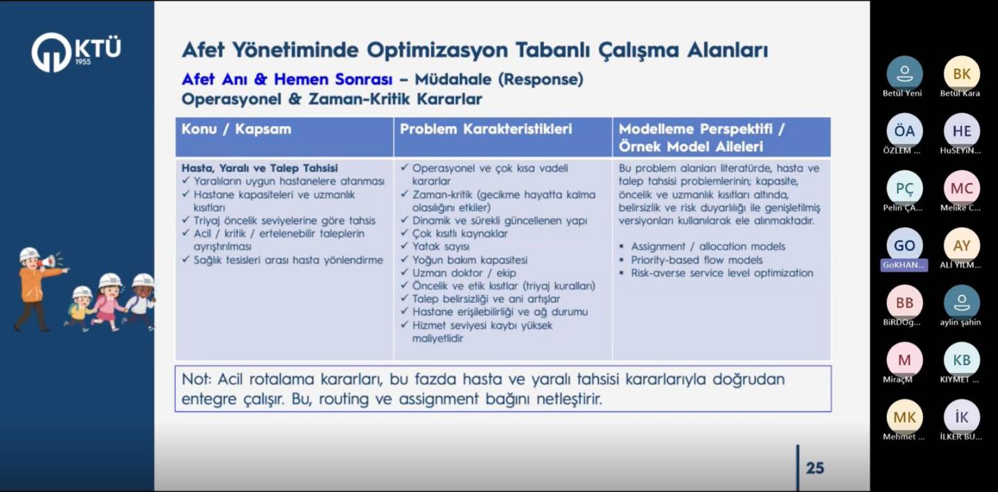 Seminerde, afet yönetiminin özellikle müdahale ve hemen sonrası aşamalarında karşılaşılan zaman-kritik ve operasyonel karar problemleri ele alındı. Hasta ve yaralı tahsisi, kaynak atama, kapasite kısıtları, talep belirsizliği ve risk temelli karar verme gibi konular, optimizasyon modelleri çerçevesinde değerlendirildi. Bu kapsamda, literatürde yaygın olarak kullanılan atama modelleri, öncelik temelli akış yapıları ve riskten kaçınan hizmet seviyesi optimizasyon yaklaşımlarına değinildi.