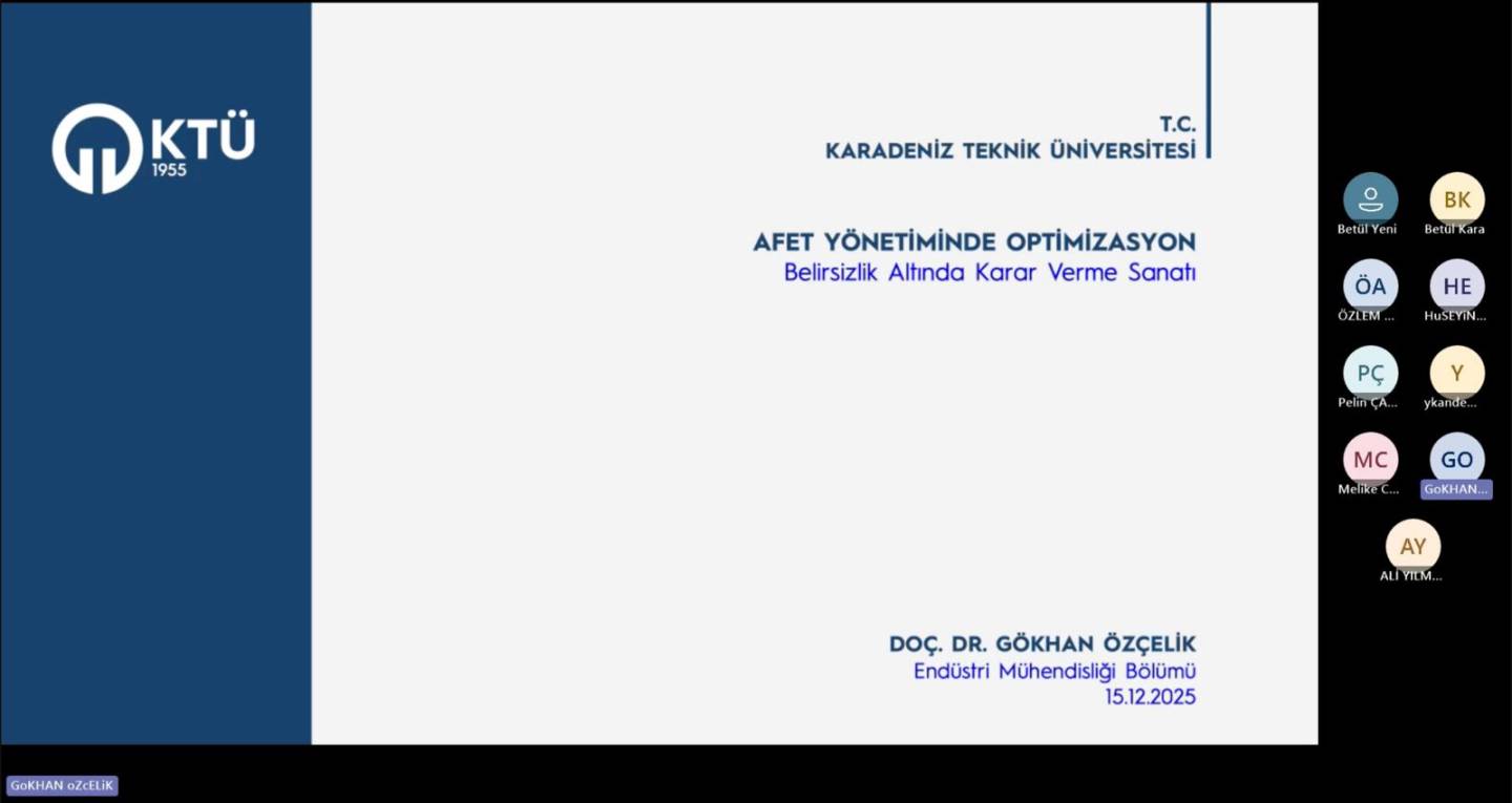Karadeniz Teknik Üniversitesi Endüstri Mühendisliği Bölümü tarafından düzenlenen seminer kapsamında, bölümümüz öğretim üyelerinden Doç. Dr. Gökhan Özçelik, “Afet Yönetiminde Optimizasyon: Belirsizlik Altında Karar Verme Sanatı” başlıklı sunumunu gerçekleştirdi.