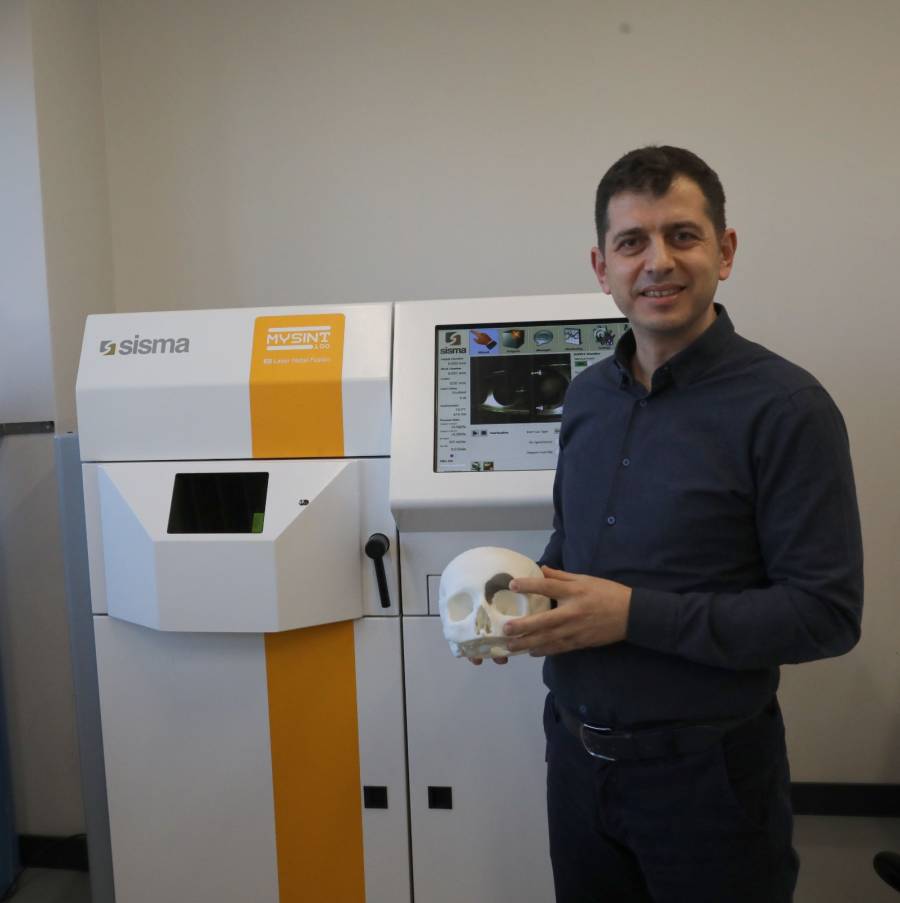 METAM Müdürü Doç. Dr. Mustafa Aslan da biyo uyumlu tozlar kullanılarak 3 boyutlu yazıcı teknolojisi ile metalin implantlar ürettiklerini söyleyerek, “Merkezimizde kişi özel implant teknolojileri üzerine çalışmalar yürütmekteyiz. Merkezimizde bulunan eklemeli imalat cihazları ile beraber cerrahların ameliyatlarda kullandıkları kişiye takılan 3 boyutlu katı implant modelleri üzerinde çalışmalar yapıyoruz. Burada bulunan cihaz da metal eklemeli imalat teknolojisi üzerine implantları ürettiğimiz bir cihaz. Bu cihaz ile özellikle biyo uyumlu tozlar kullanılarak 3 boyutlu yazıcı teknolojisiyle karmaşık geometri ile metal implantlar üretiyoruz. Burada doktorlarımızın önerileriyle tasarım süreçlerinden sonra uygun geometri elde edilip, onayları alındıktan sonra bu cihaz vasıtasıyla toz halinde mikron seviyesinde olan ham maddelerimiz burada lazer teknolojisi ile birlikte birbirine eklenerek katı modeller üretiliyor. Uluslararası anlamda medikal cihaz regülasyonuna tabiyiz; bu anlamda da hem SGK ile hem de tıbbi cihaz kurumuyla süreçlerin geliştirilmesi anlamında çalışmalar yapmaktayız” şeklinde konuştu.