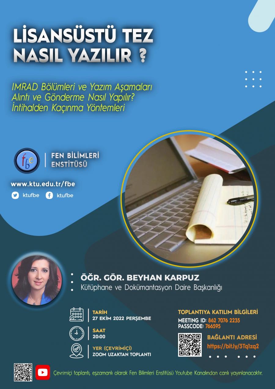 Enstitümüzde öğrenim görmekte olan lisansüstü öğrencilerimiz için 27 Ekim 2022 Perşembe Günü Saat 20:00’da ZOOM Uzaktan Toplantı Uygulaması üzerinden çevimiçi olarak "Lisansüstü Tez Nasıl Yazılır?" başlıklı eğitim etkinliği düzenlenecektir.