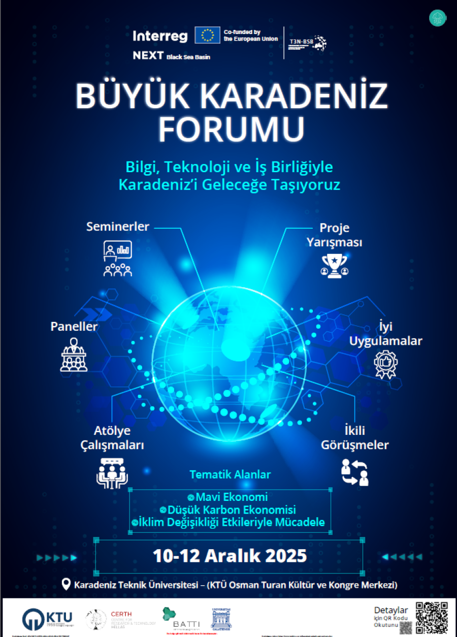 Üniversitemiz ev sahipliğinde, 10-12 Aralık 2025 tarihlerinde düzenlenecek olan Büyük Karadeniz Forumu (Grand Black Sea Forum), Karadeniz Havzası'ndaki akademi, sanayi, girişimcilik ve kamu kurumlarını bir araya getirerek bölgesel iş birliğini güçlendirmeyi ve sürdürülebilir kalkınma hedeflerine katkı sağlamayı amaçlamaktadır.