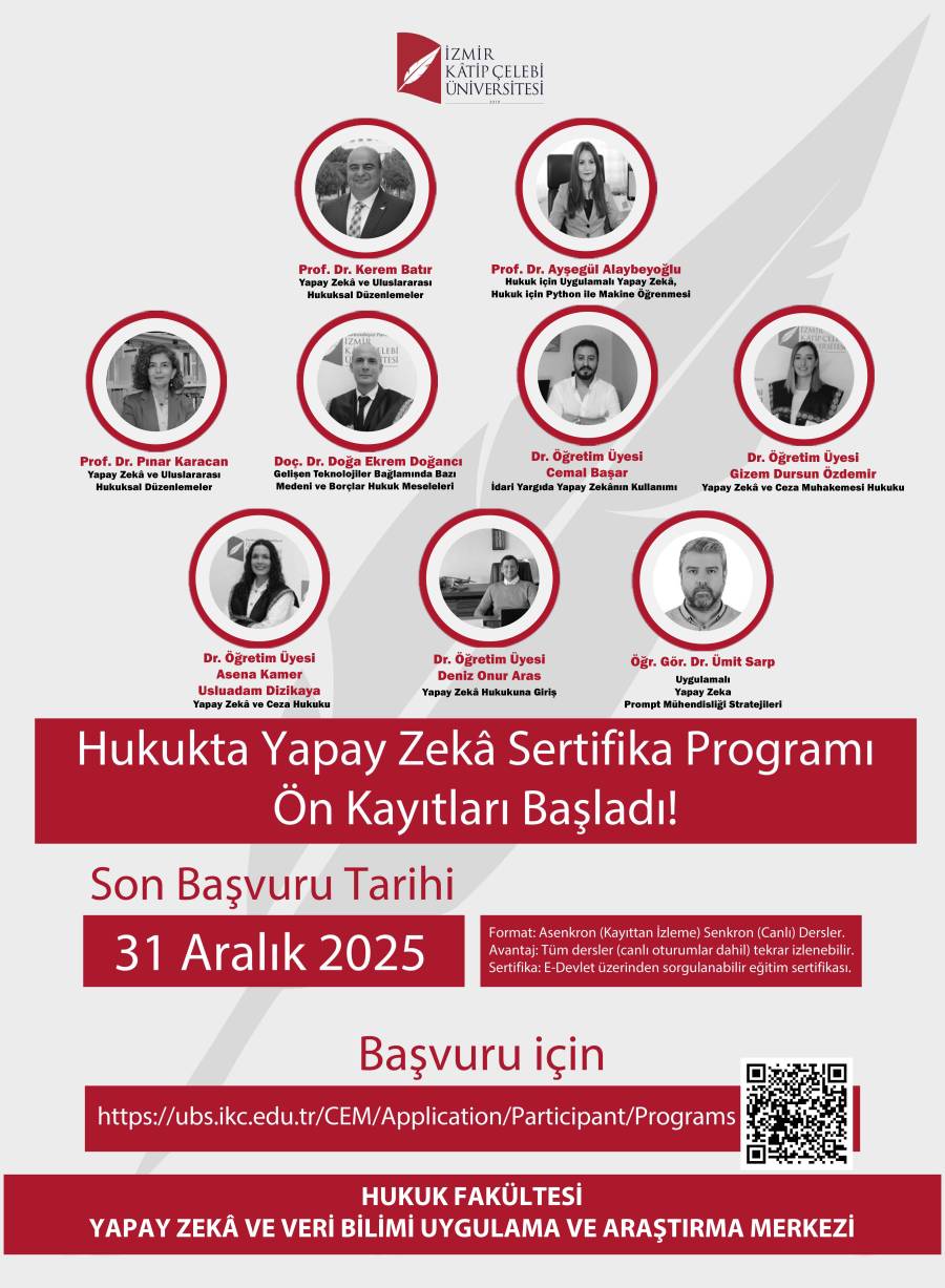 İzmir Katip Çelebi Üniversitesi tarafından "Hukukta Yapay Zekâ Sertifika Programı" eğitimi düzenlenmesi planlanmaktadır. Eğitim planıyla ilgili detaylara https://ubs.ikc.edu.tr/CEM/Application/Participant/Programs adresinden ulaşılabilmektedir.
