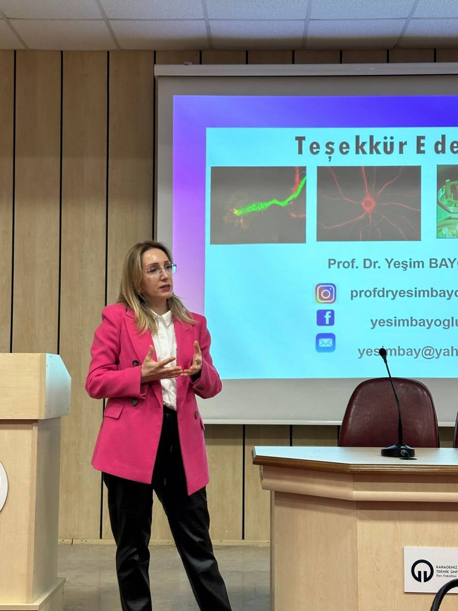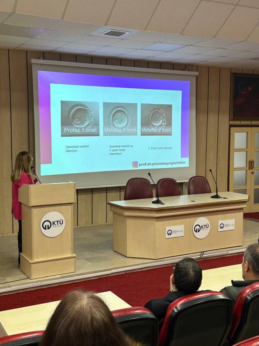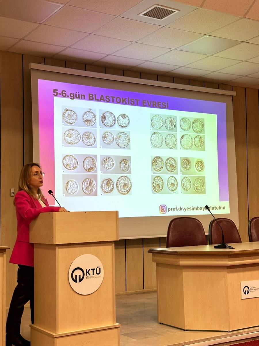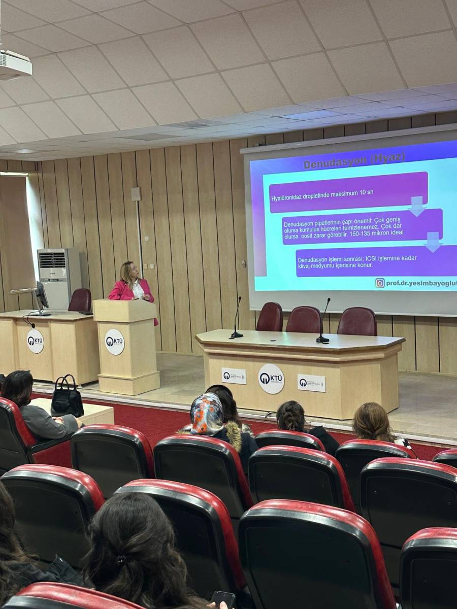 Sunum kapsamında Biyologların görev ve yetkilerine, Embriyolog olmak için hangi alanlarda ne gibi yeterliliklere sahip olunması gerektiğine, tüp bebek merkezlerindeki laboratuvarlarda gerçekleştirilen faaliyetlere, Biyologların dünyada ve ülkemizdeki rolüne değinen Prof. Dr. Yeşim BAYOĞLU TEKİN, ders planında yer alan “infertilite” konusu kapsamında bilgilendirmelerde bulunmuştur. Bu alanlarda yapılan çalışmalara ve yeni teknolojilere değinen Prof. Dr. Yeşim BAYOĞLU TEKİN, sunumu gerçekleştirmesinin ardından öğrencilerle soru-cevap düzenlemiş ve ders sonlandırılmıştır.