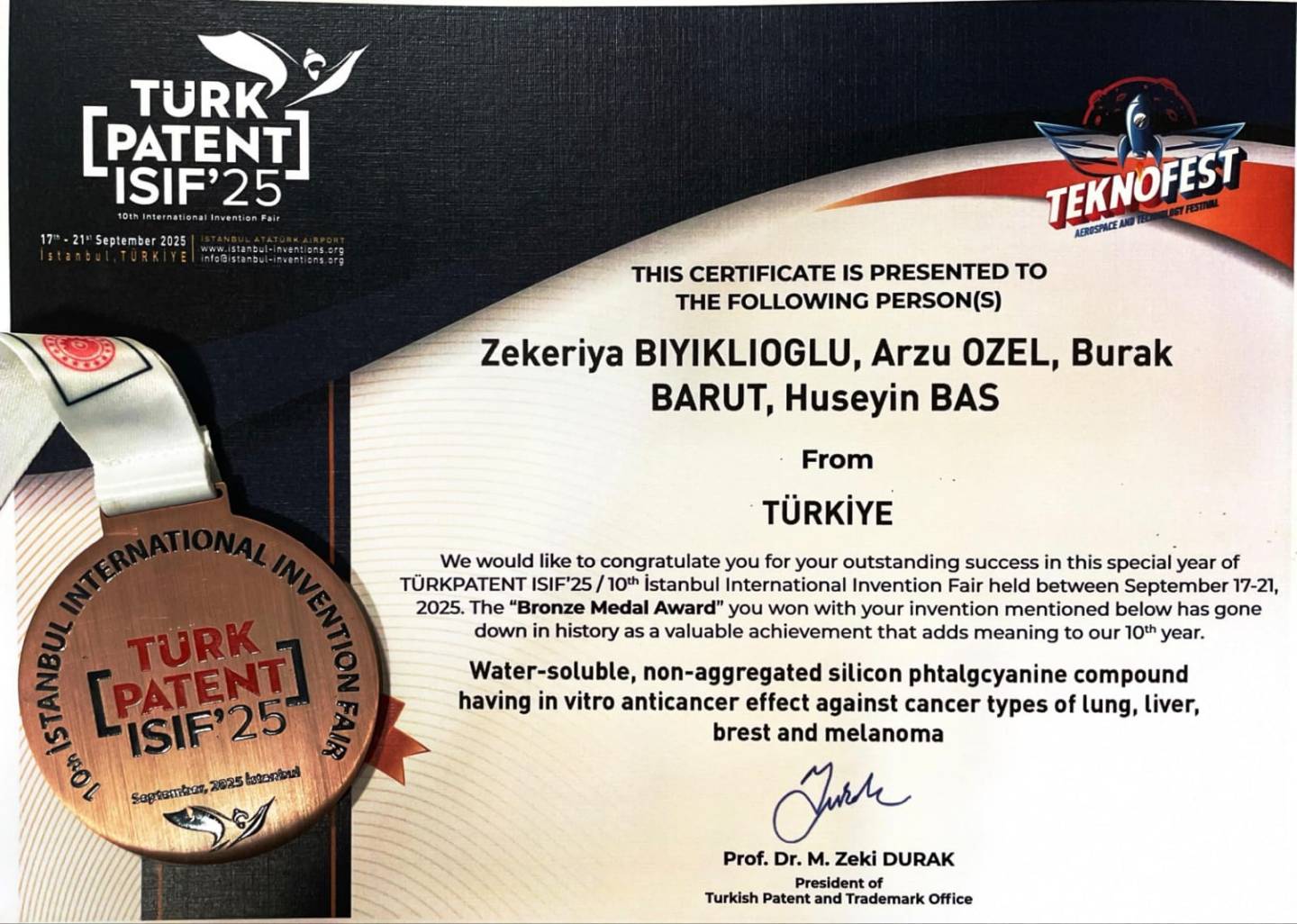 “Akciğer, Karaciğer, Meme ve Cilt Kanser Türlerine Karşı İn Vitro Yüksek Antikanser Etkiye Sahip Suda Çözünebilen ve Agregasyon Göstermeyen Silisyum Ftalosiyanin Bileşikler” Projesi ile