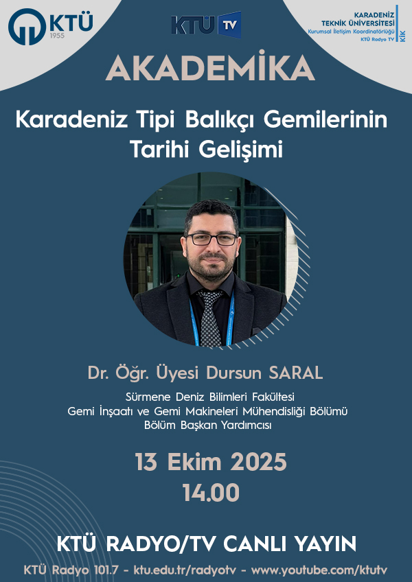 Bölüm Başkan Yardımcısı Dr. Öğr. Üyesi Dursun SARAL 13 Ekim 2025 tarihinde saat 14.00'te KTÜ RADYO/TV'nin canlı yayın konuğu olmuş ve "Karadeniz Tipi Balıkçı Gemilerinin Tarihi Gelişimi" konulu program yapılmıştır.