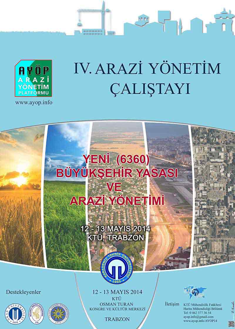 Arazi Yönetim Platformu (AYÖP) tarafından, ilk olarak 2011 yılında Okan Üniversitesinde, ardından İstanbul Teknik Üniversitesi ve Yıldız Teknik Üniversitesinde gerçekleştirilen "Arazi Yönetimi Çalıştayı"nın dördüncüsü, bu yıl 12-13 Mayıs 2014 tarihlerinde Karadeniz Teknik Üniversitesi ev sahipliğinde Trabzon’da gerçekleştirilecektir. Bu yılki çalıştayın ana teması “Yeni (6360) Büyükşehir Yasası ve Arazi Yönetimi” olarak belirlenmiştir.