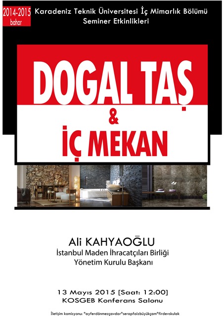İstanbul Maden İhracatçıları Birliği Yönetim Kurulu Başkanı Ali KAHYAOĞLU, "Doğal Taş ve İç Mekan" konulu bir seminer verecektir. Tüm öğrenciler, akademik ve idari personelimiz davetlidir.