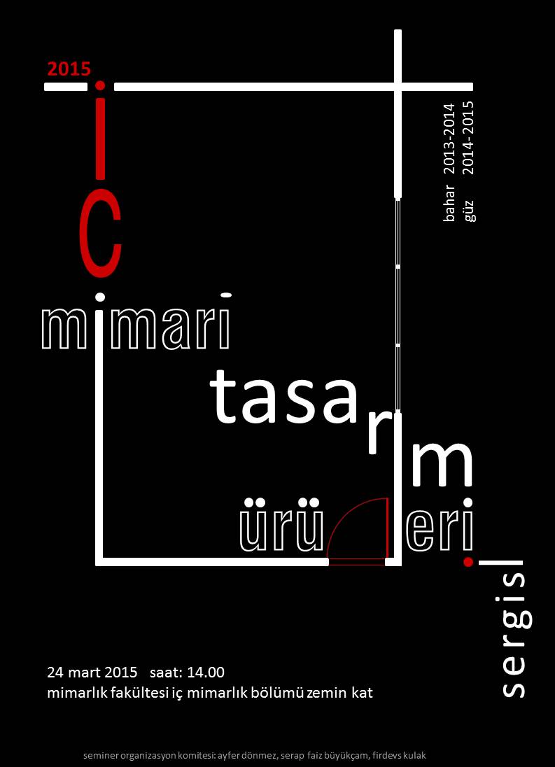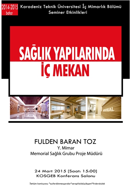 2014-2015 Eğitim Öğretim Yılı Bahar Yarıyılı kapsamında bölümümüzde düzenlenecek olan "İç Mimari Tasarım Ürünleri Sergisi"ne ve Memorial Sağlık Grubu Proje Müdürü Y. Mimar Fulden Toz'un konuk olarak katılacağı "Sağlık Yapılarında İç Mekan" seminerine tüm öğrenciler, akademik ve idari personel davetlidir.