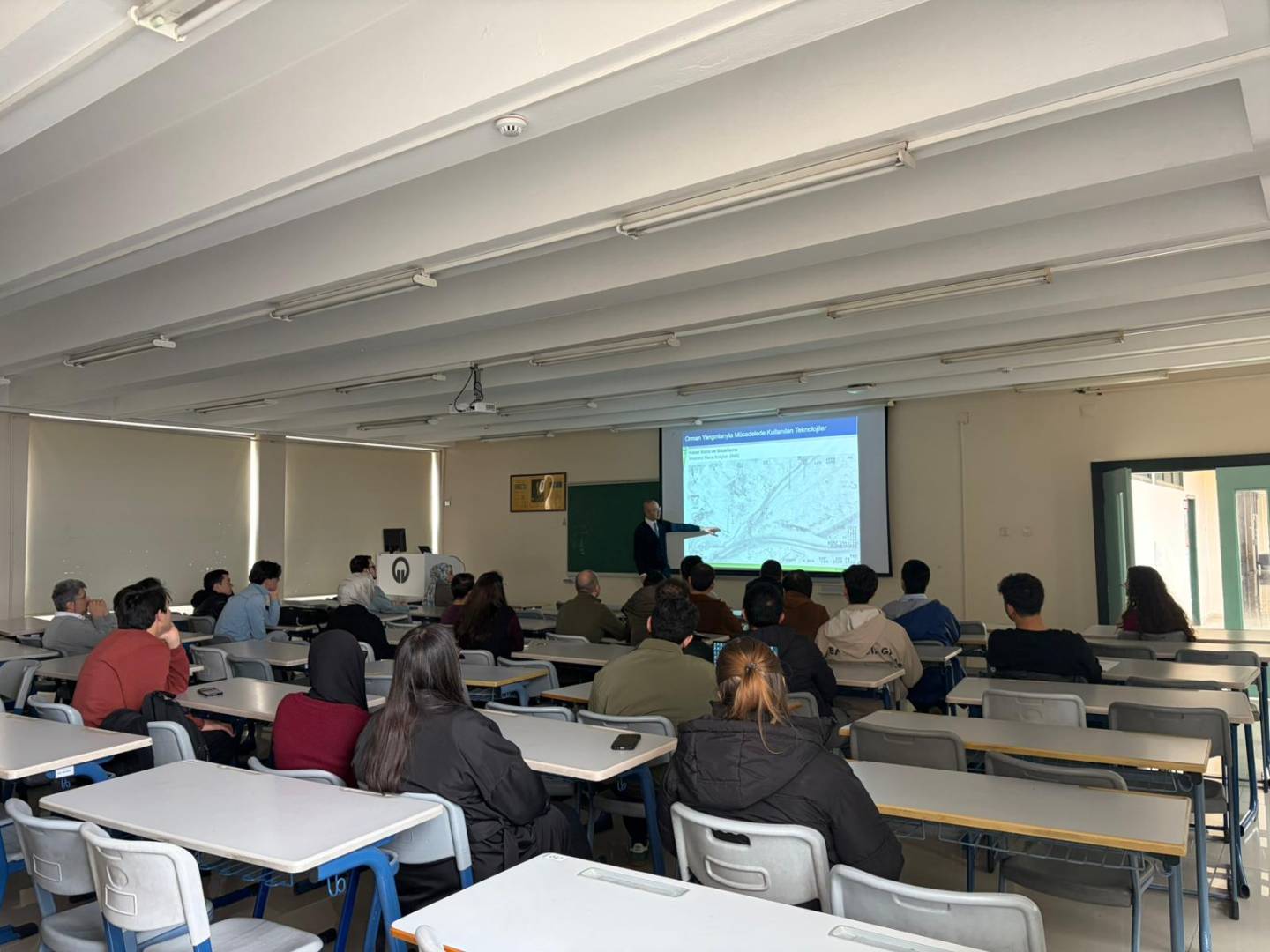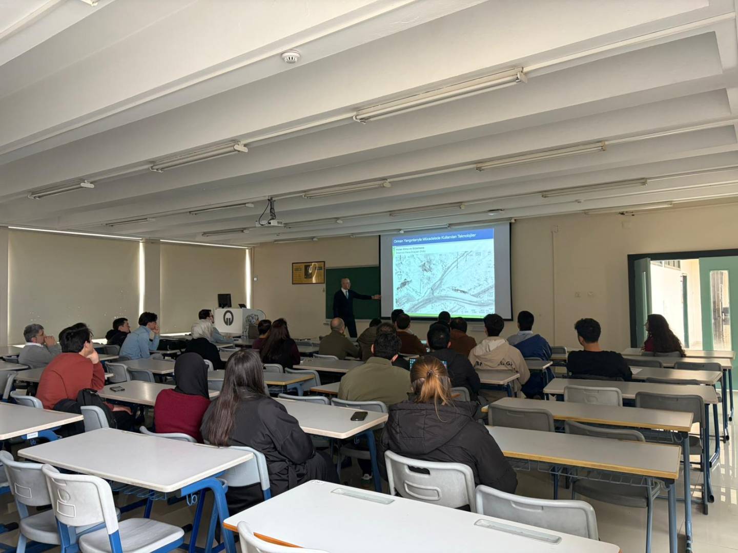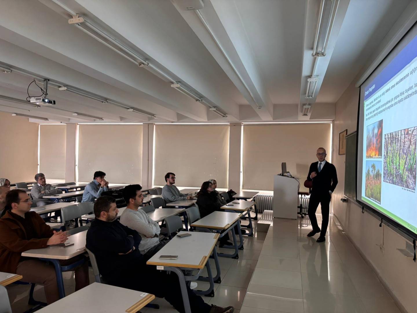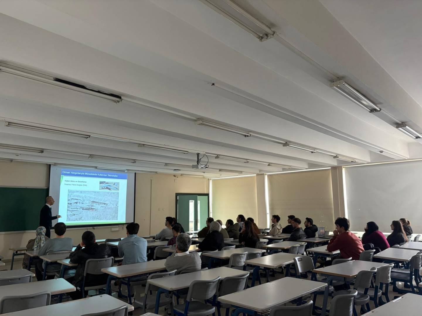Etkinliğin konuşmacısı Doç. Dr. Kadir Alperen COŞKUNER, orman yangın yönetiminde kullanılan yeni teknolojiler, erken uyarı sistemleri, insansız hava araçları ve veri temelli analiz yöntemleri üzerine değerli paylaşımlarda bulundu. Ayrıca yangınların çevresel, ekonomik ve toplumsal etkilerine dikkat çekerek, bilinçli müdahalenin ve önleyici çalışmaların önemini vurguladı. Sunumu, öğrencilerimizin konuya dair farkındalığını artırırken akademik anlamda da önemli katkılar sağladı.