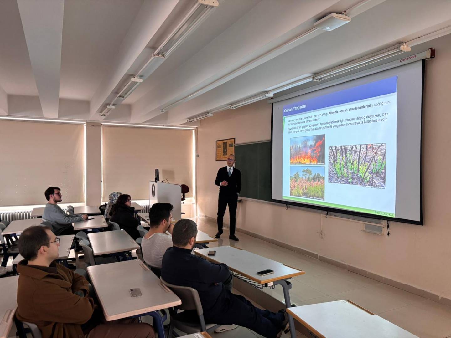 Üniversitemizde düzenlenen “Orman Yangın Yönetiminde Yeni Teknolojiler” etkinliği, akademik personelimiz ile lisans ve lisansüstü öğrencilerimizin yoğun katılımıyla başarıyla gerçekleştirildi. Etkinlik kapsamında orman yangınlarının çıkış nedenleri, yangınların yayılma dinamikleri, önleme stratejileri ve söndürme yöntemleri kapsamlı şekilde ele alındı. Katılımcılar, hem teorik hem de uygulamaya dönük güncel bilgiler edinme fırsatı buldu.