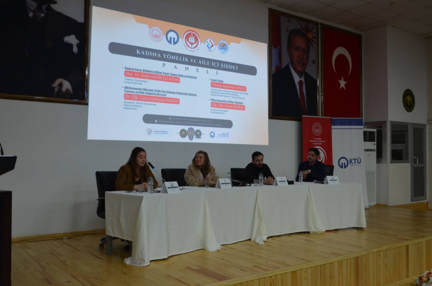 Panelde;Doç. Dr. Seda Gayretli Aydın (Trabzon Üniversitesi Hukuk Fakültesi) “Kadına Karşı Şiddetin Dijital Yüzü: Yapay Zekâ ve Cinsiyet”, Dr. Öğr. Üyesi Güleycan Akgöz (KTÜ Psikoloji Bölümü) “Görünmeyeni Görmek: Polis İçin Sahada Psikolojik Şiddeti Tanıma ve Risk Değerlendirmesi” başlıklı sunumuyla moderatörlük görevini, Tolunay Bayraktar Kayacı (Trabzon Aile ve Sosyal Hizmetler İl Müdürlüğü – Akçaabat Sosyal Hizmet Merkezi) “Israrlı Takip”,Öğr. Gör. Burak Bayrak (Avrasya Üniversitesi Psikoloji Bölümü) ise “Öfke Kontrolü ve Öfke Yönetimi” başlıklı sunumlarıyla katkı sundu. Etkinlik, soru-cevap bölümünün ardından sona erdi.